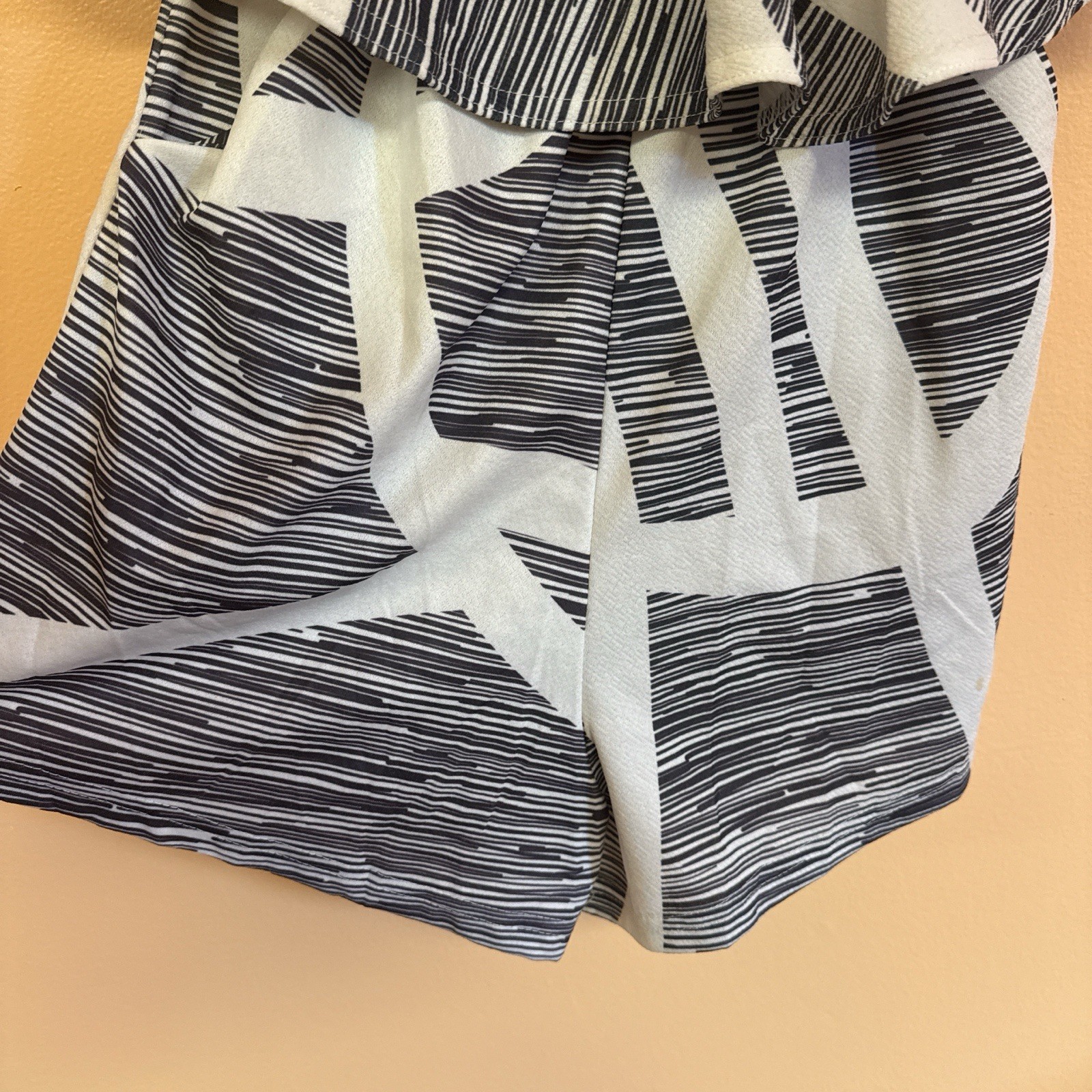 Blue and white off the shoulder romper with ruffle detail and POCKETS