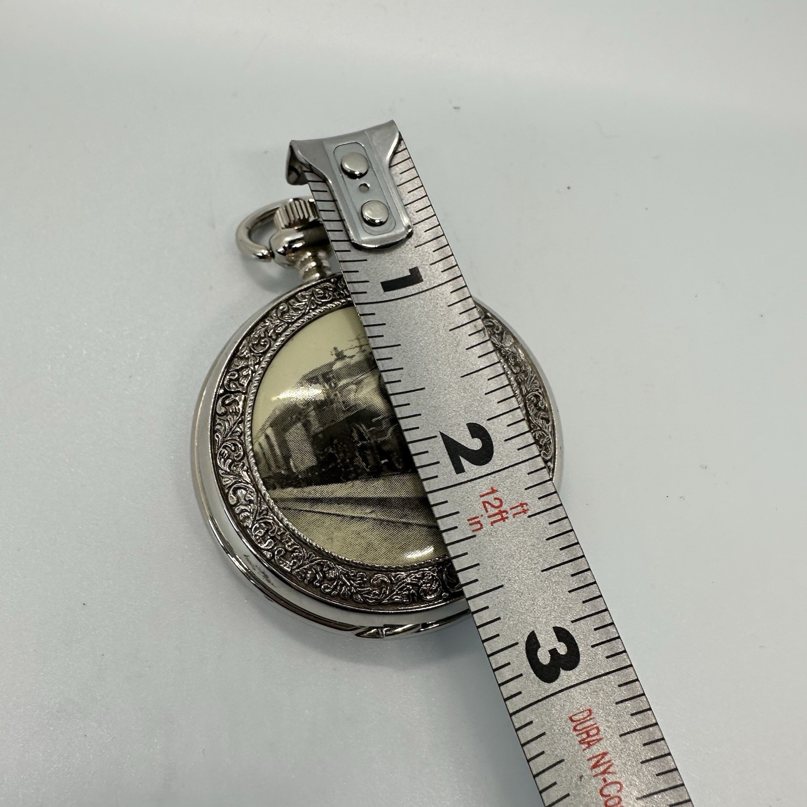 Vtg Quartz TRAIN POCKET WATCH Untested Needs Battery Silver Tone Train Print