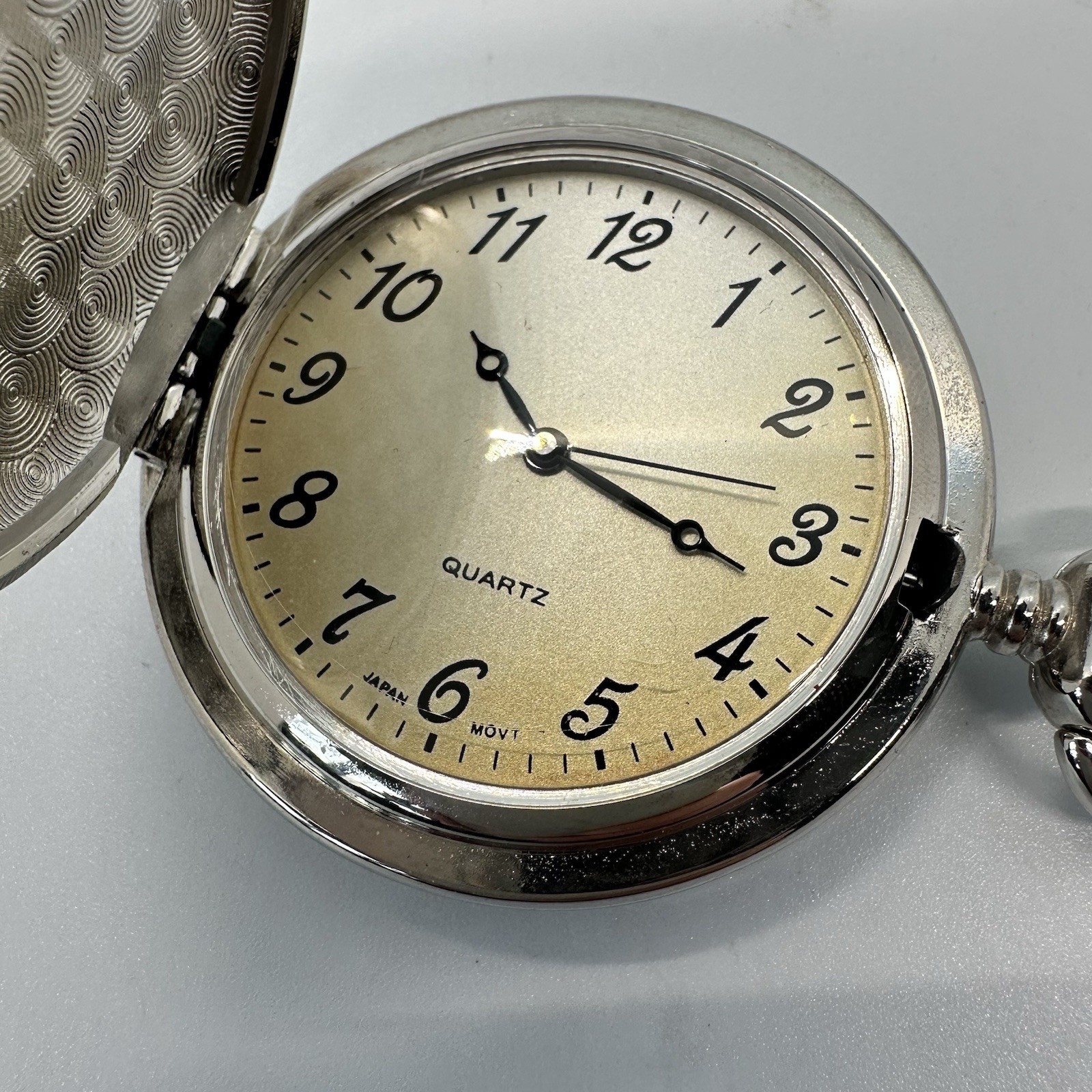 как выглядит Vtg Quartz TRAIN POCKET WATCH Untested Needs Battery Silver Tone Train Print фото