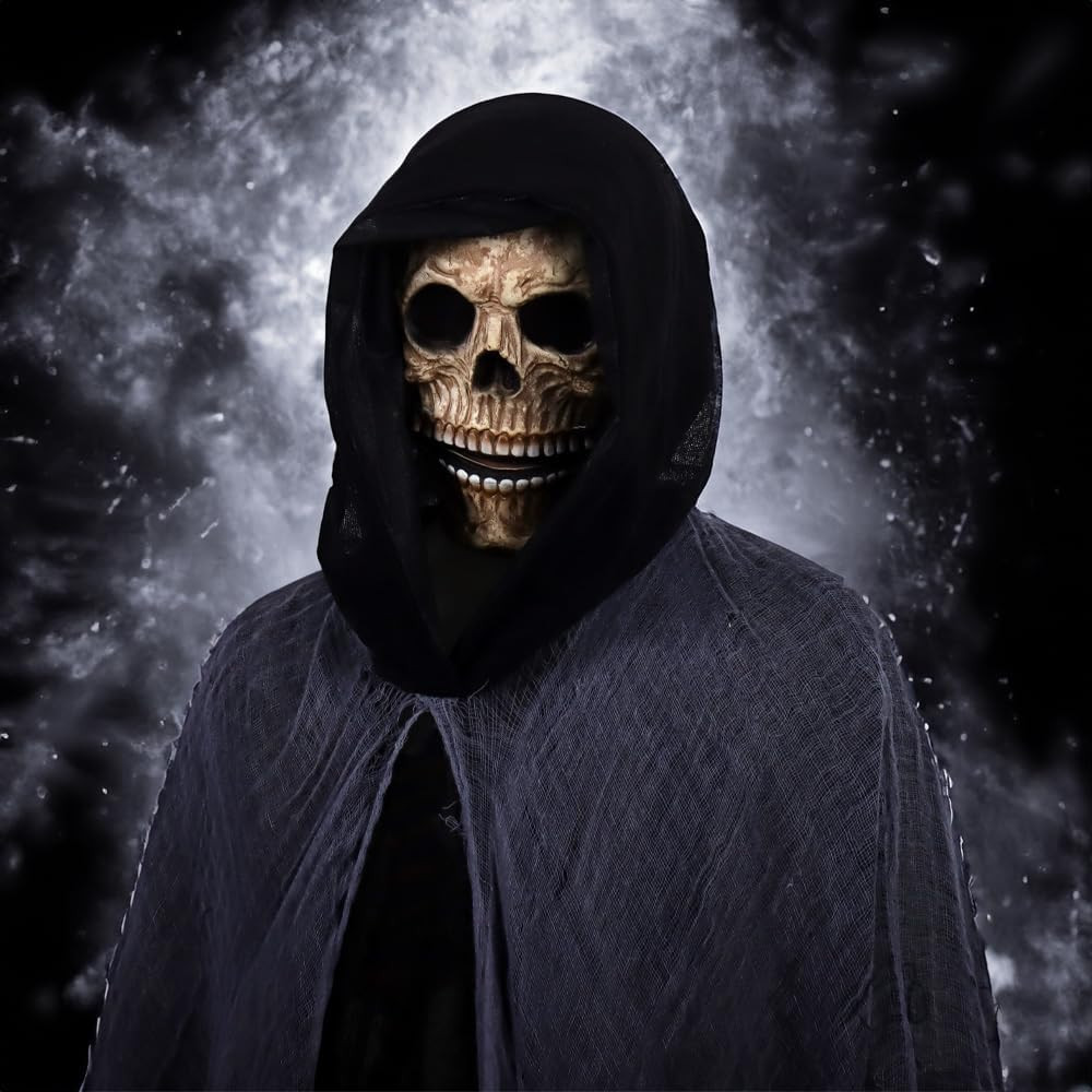• Realistic Creepy Halloween Full Head Skull Mask with Movable Jaw, Comfortable Fi