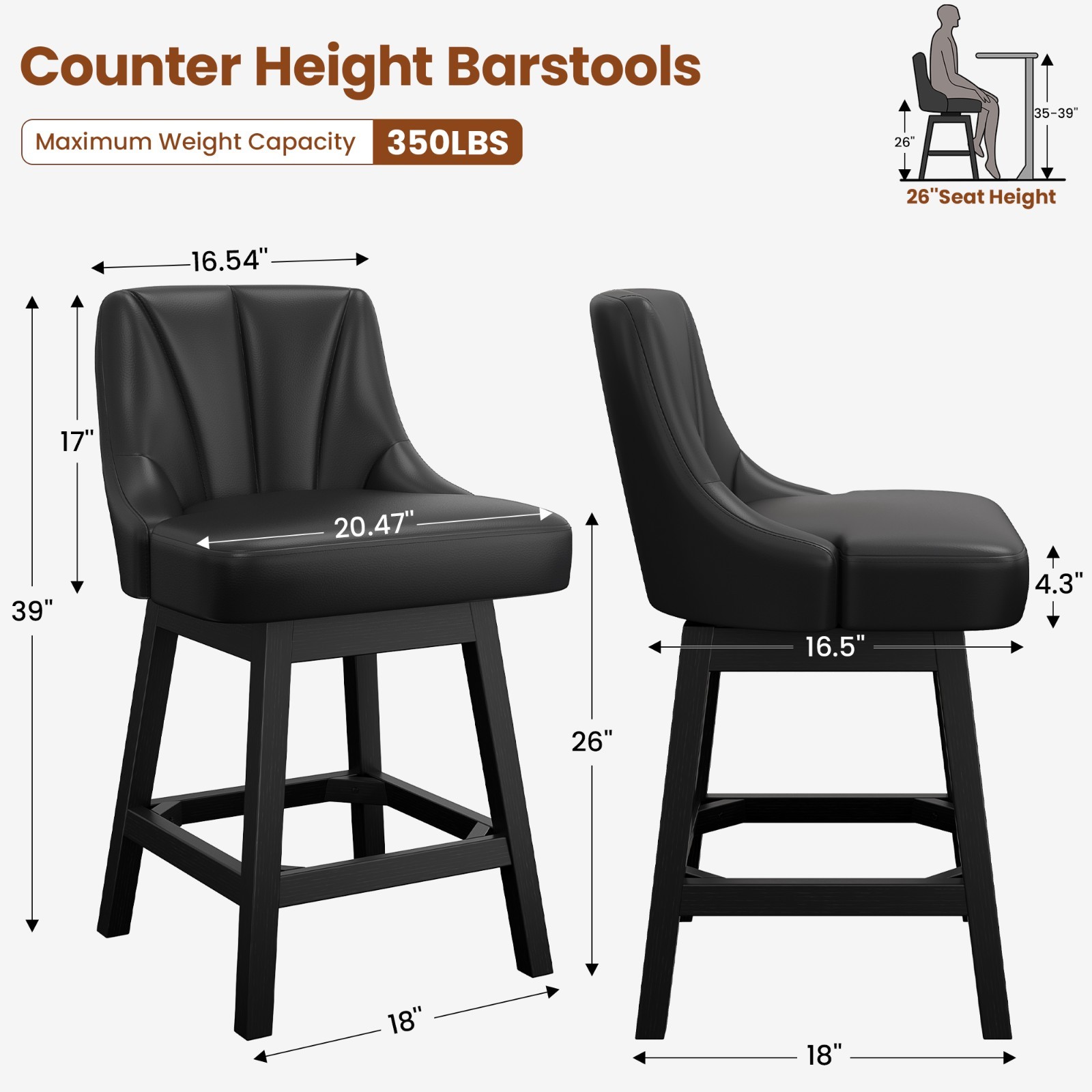 Pre-Owned 26 Swivel Bar Stools Set of 2 w/Back PU Leather for Kitchen Black