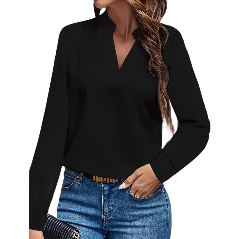 Women Long Sleeve Shirt V Neck Simple Office Elegant Lady Chiffon Blouse Tops