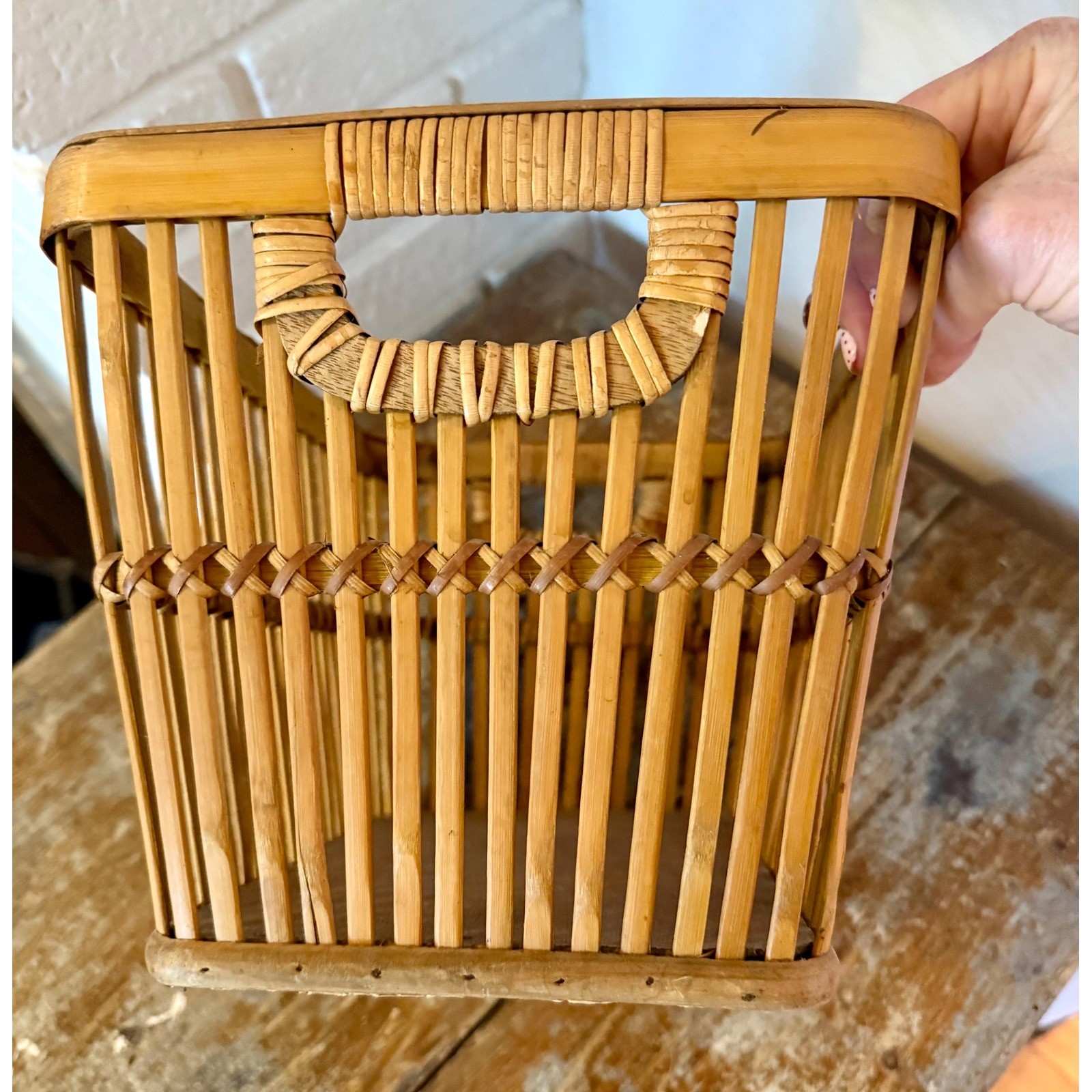 Vintage rustic bamboo basket with handles 12x7.5x8