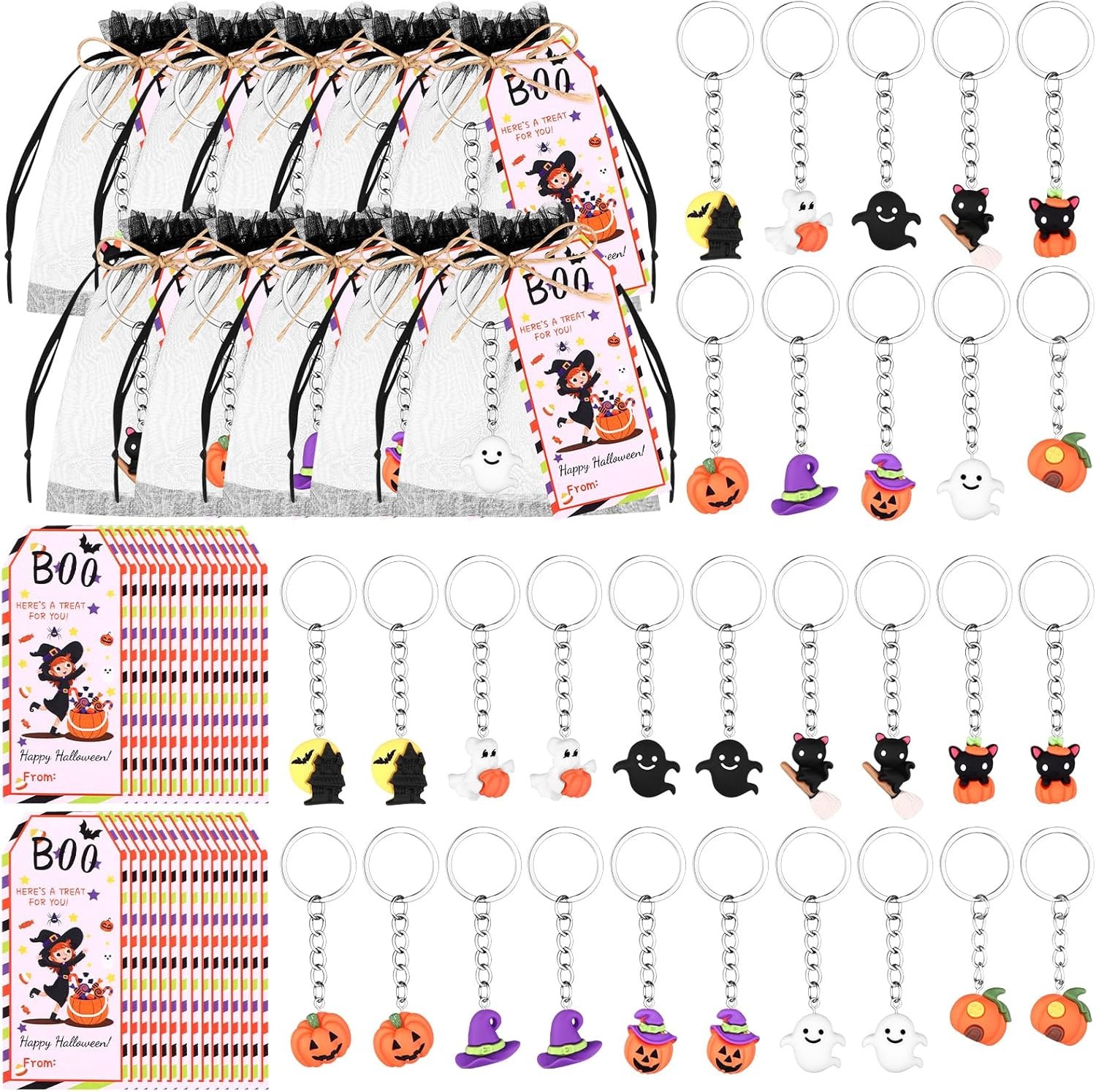 90 Pcs Halloween Keychain Gifts Set Include 30 Pumpkin Ghost Cat Bat Keychain 30