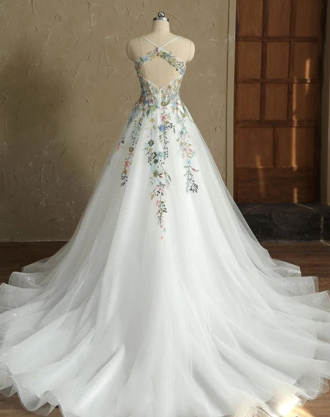 Elegant Flowers Embroidery Flowers Wedding Dresses with Spaghetti Straps Bridal