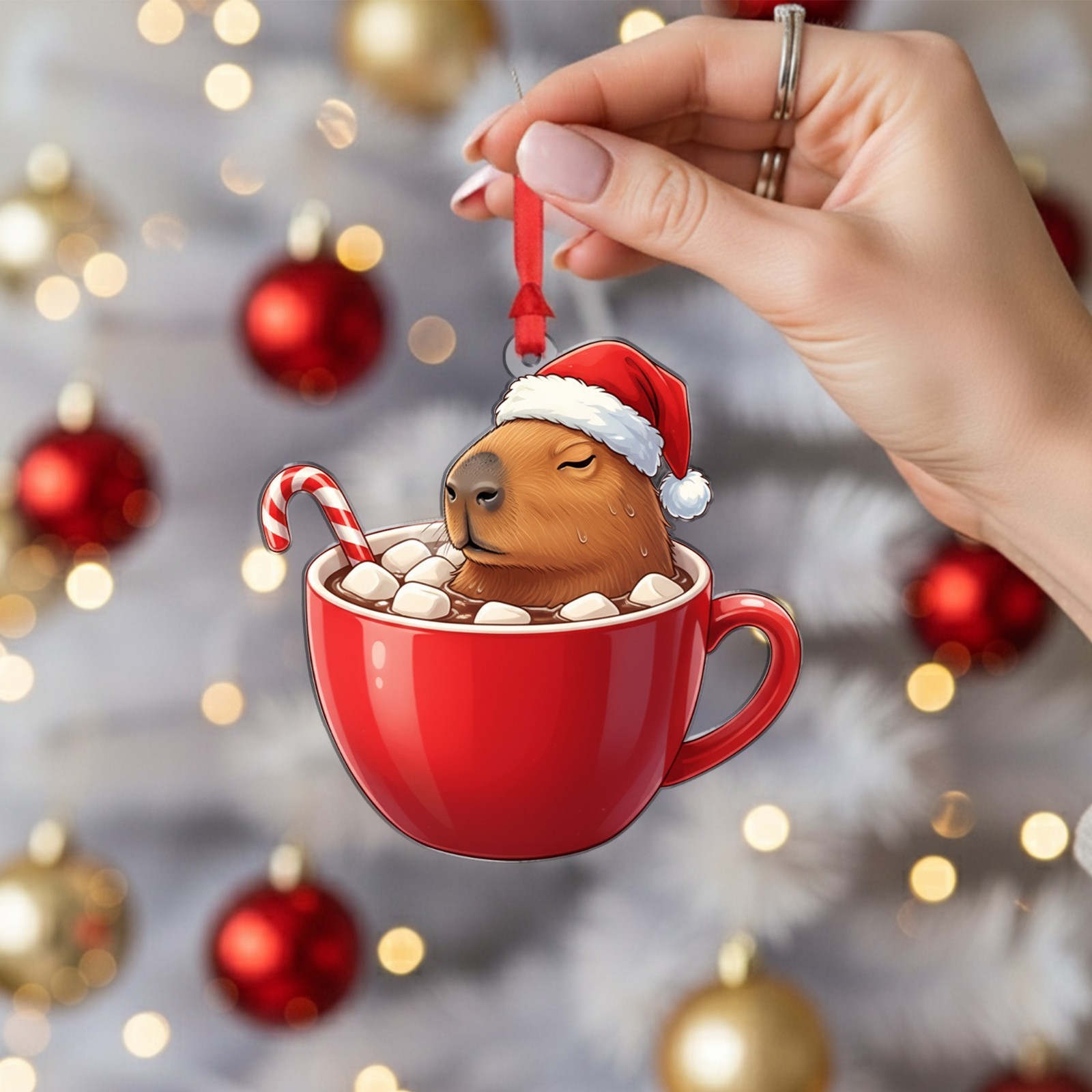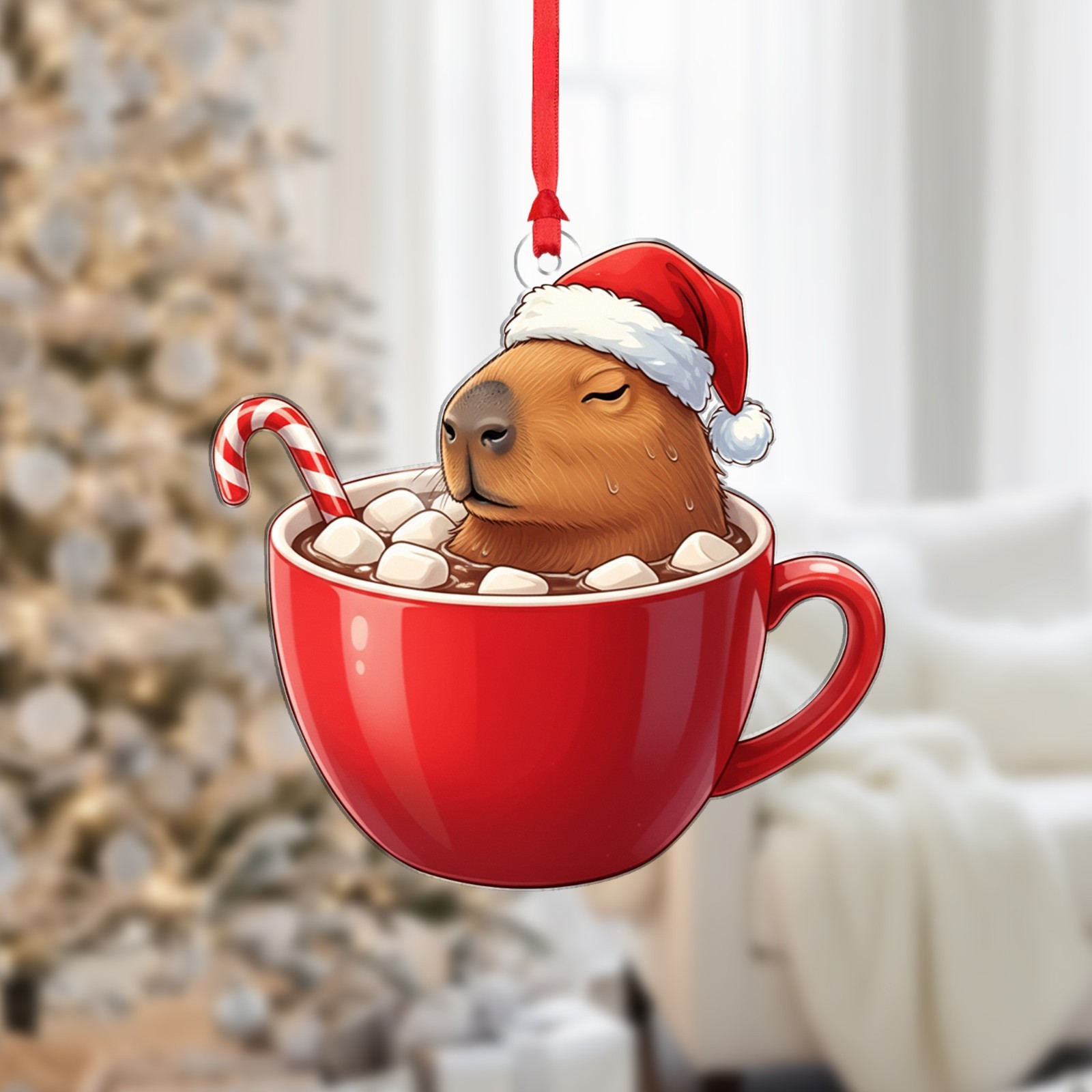 Capybara in Mug Christmas Ornament with Santa Hat