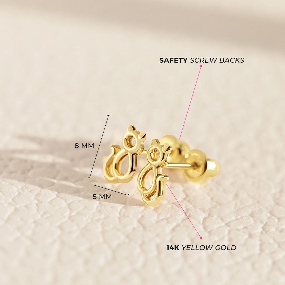 14k Yellow Gold Little Kitten Screw Back Earrings for Toddlers to Little Girls