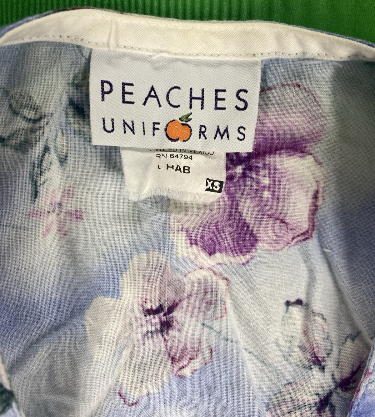 XS Blue and Purple Flower Patterned Peaches Scrub Top