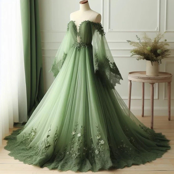 Green Off the Shoulder Wedding Dresses Lace Appliques V Neck Tulle Bridal Gowns