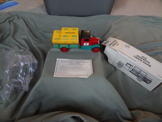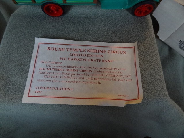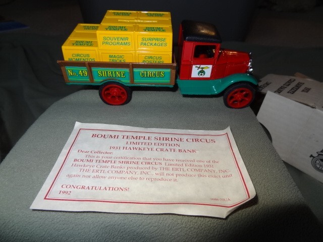 ERTL 1931 HAWKEYE CRATE BANK - Boumi Temple Shrine Circus with Key