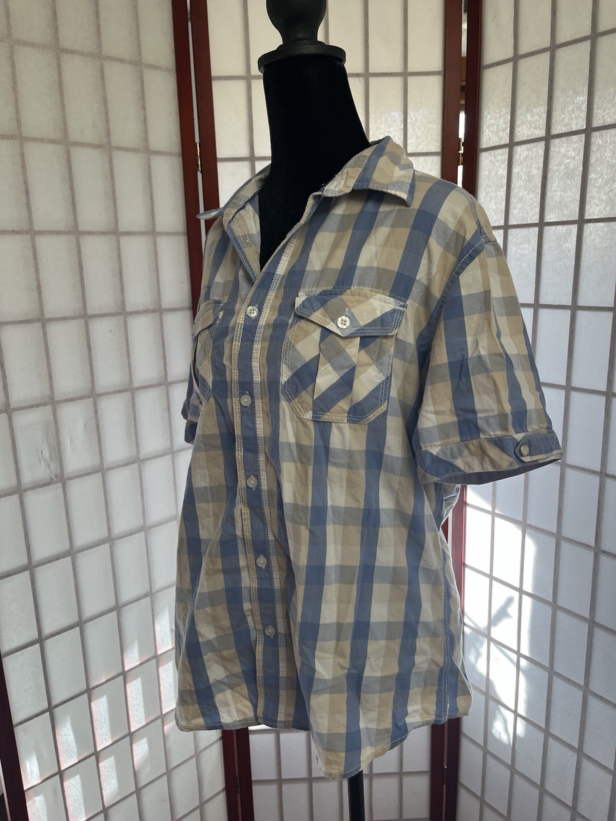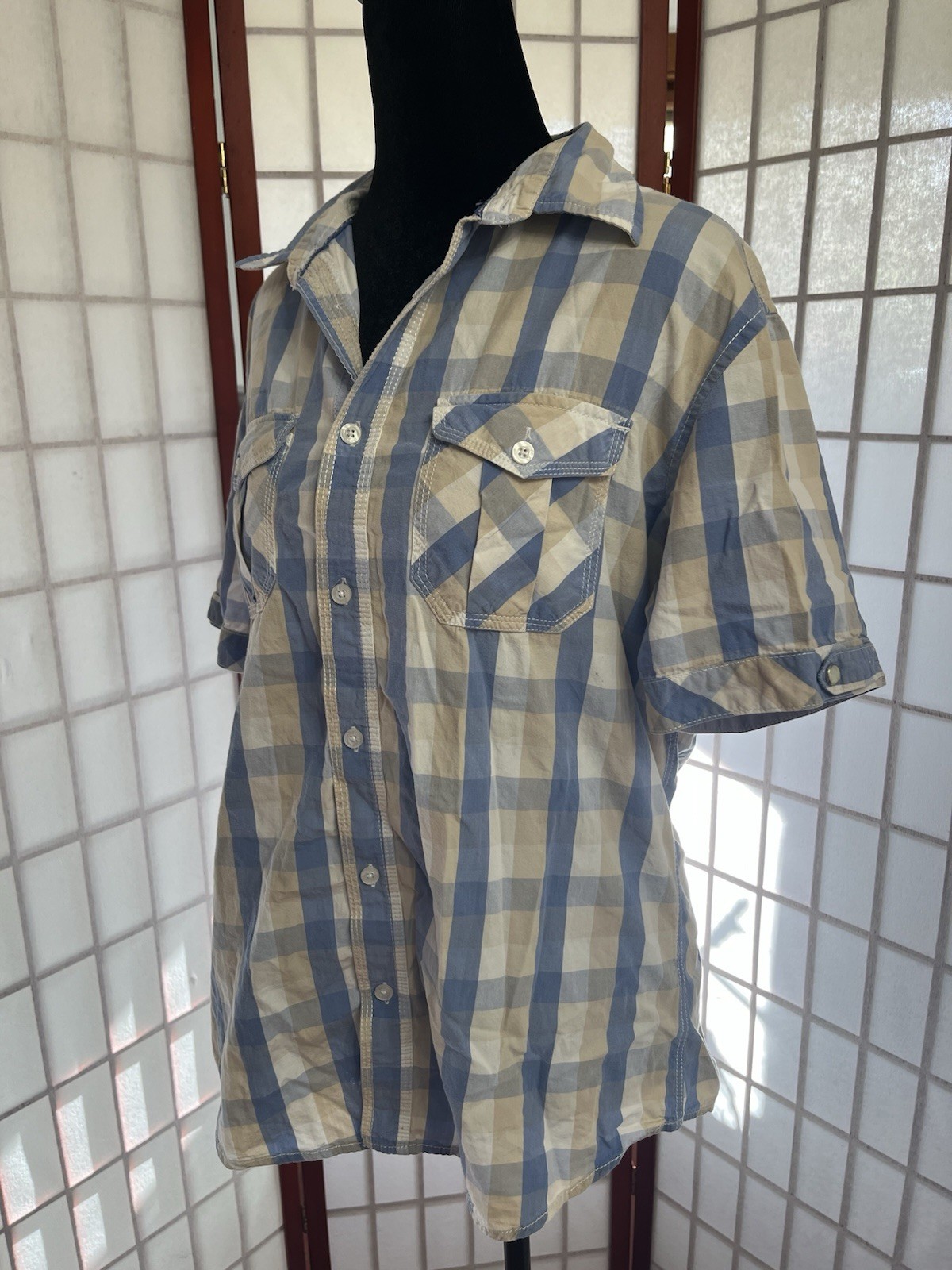 как выглядит PD C 100 cotton Blue, tan and white plaid short sleeve button up. M фото