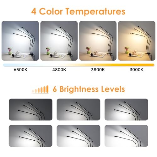 3-Head LED Desk Lamp with Clamp, Eye-Caring Clip-on Light for Home Office, 4