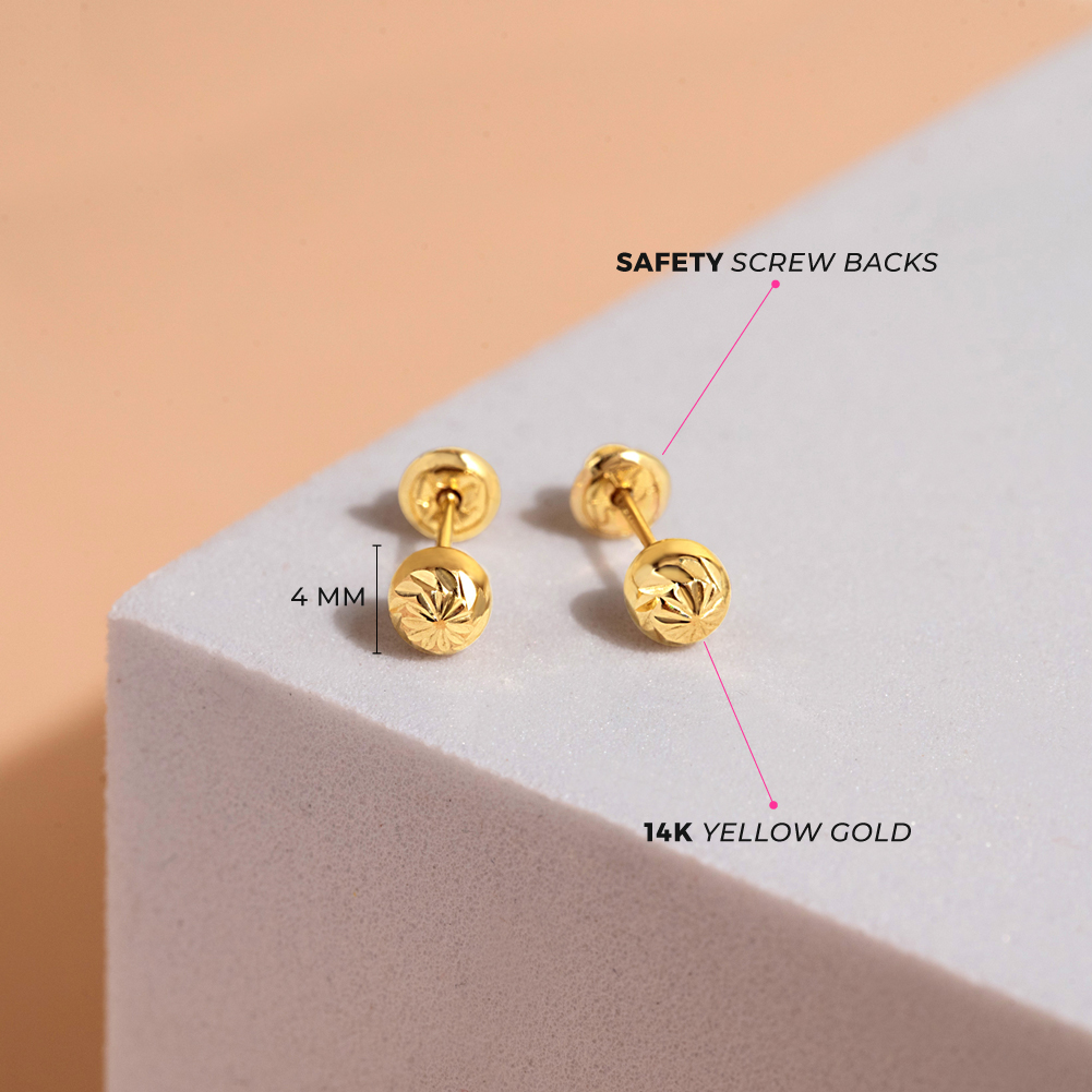 14K Yellow Gold Young Girl's Round Diamond Cut Ball Screw Back Earring Studs