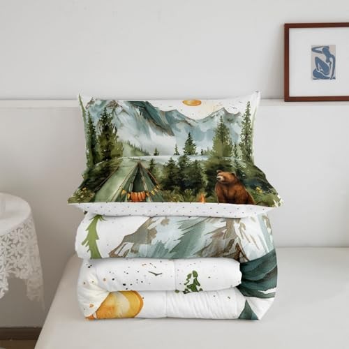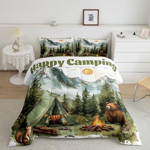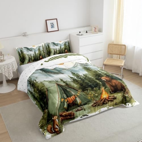 Camping Theme Comforter Set,Kids RV Camper Bedding Set Twin Green and Brown