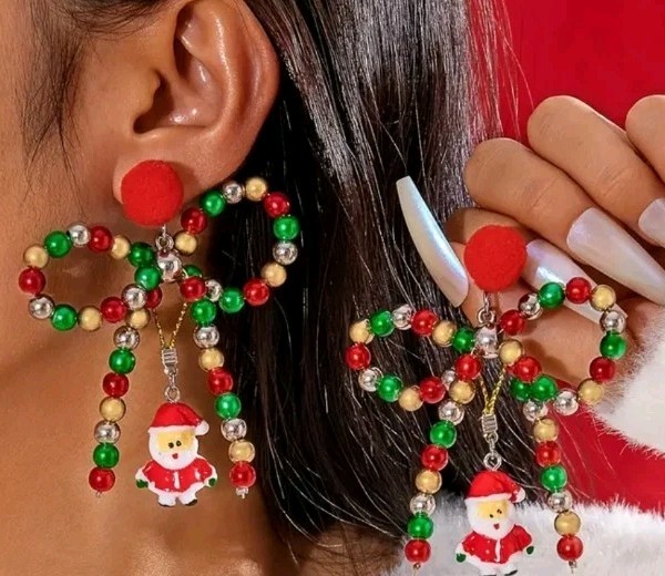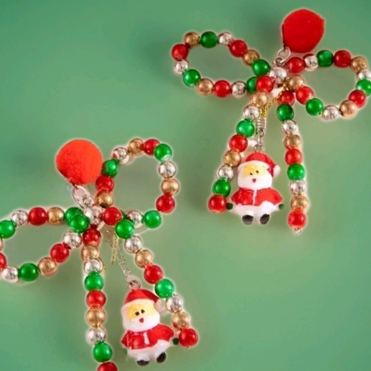 как выглядит Large Beaded Christmas Bow Earrings With Dangling Santa. Stud ,teens adults фото
