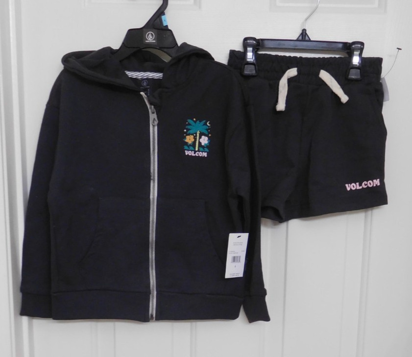 NWT 2pc Volcom Black Hooded Zip Tropical Logo Sweatshirt Shorts Set sz 5 or 6