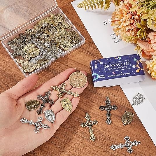 1 Box 60Pcs 6 Styles Rosary Cross Charms Crucifix Charm Easter Holiday Antiqu..