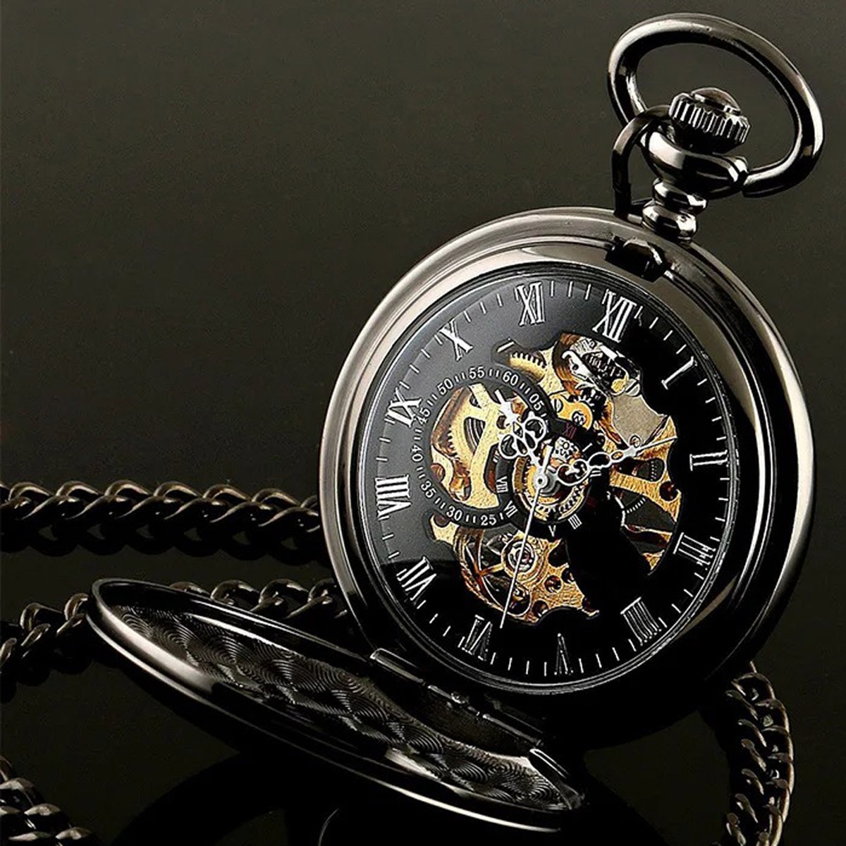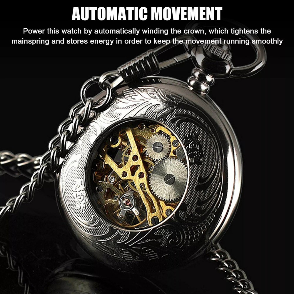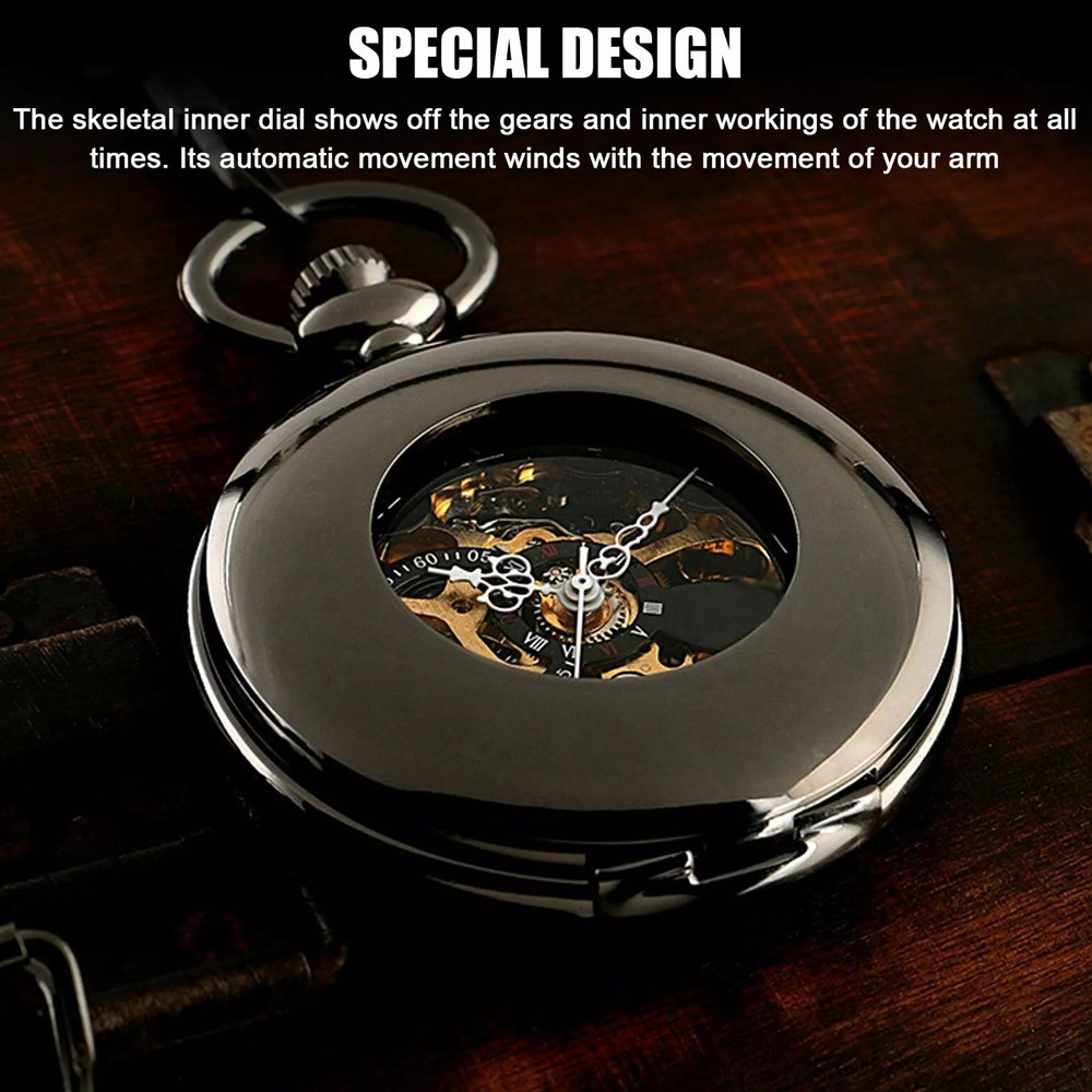 Classic Mens Pocket Watch Mechanical Black Steampunk Skeleton Luxury Retro Chain