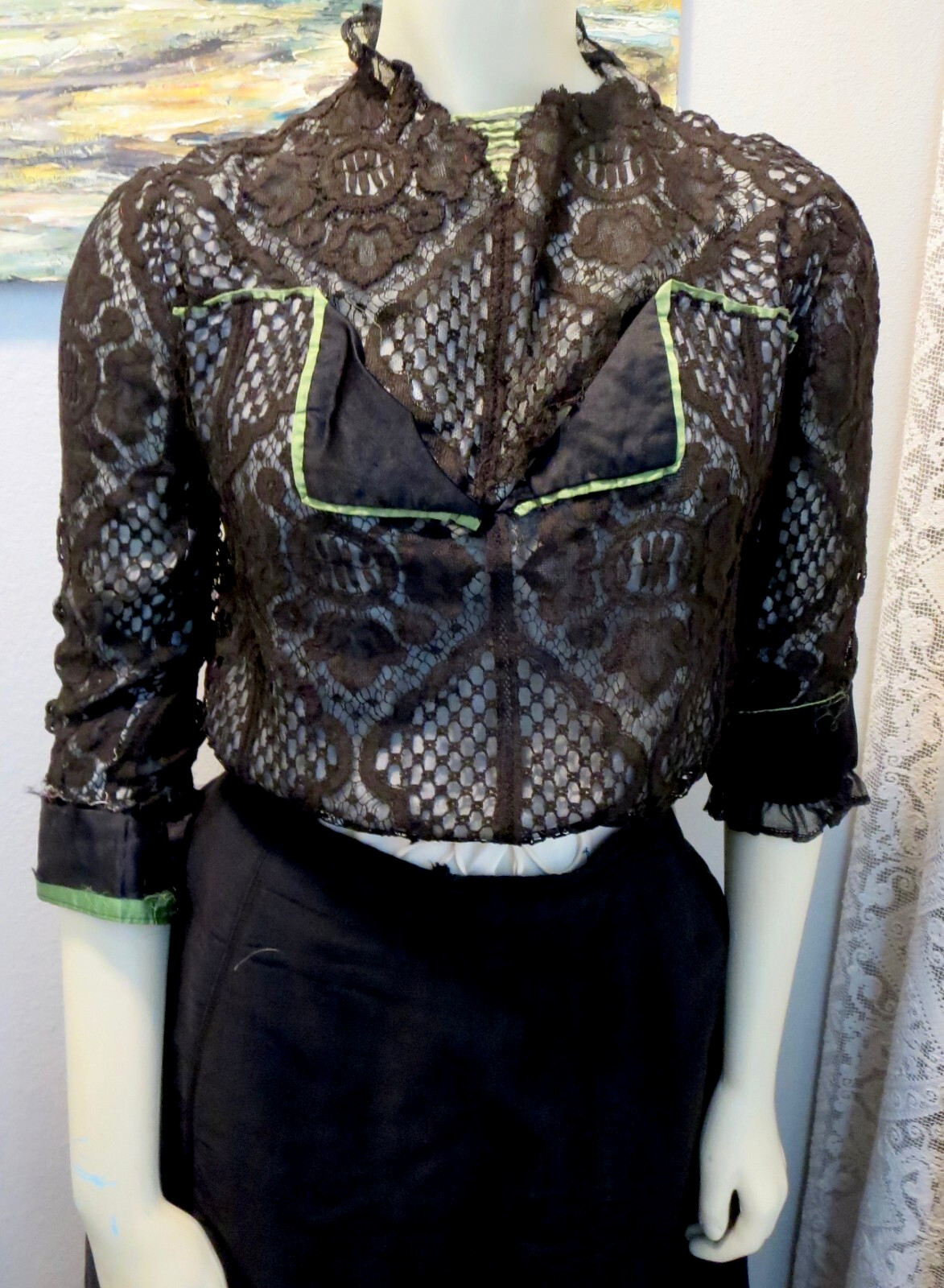 Antique Victorian 1900s Black Bobbin Lace Silk Bodice Top Green Trim 34B