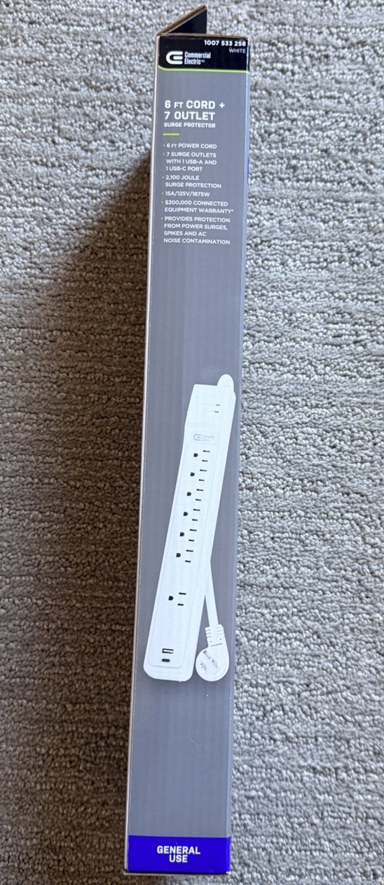 как выглядит Commercial Electric 7-Outlet Surge Protector with USB White 6 ft. фото