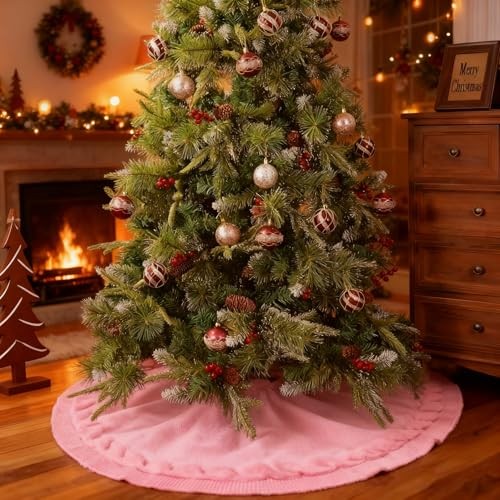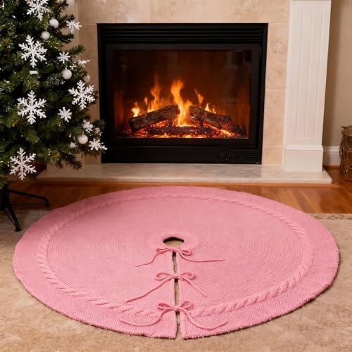 36-Inch Christmas Tree Skirt, Twisted Tie-Belt Knit Tree Skirt, Retro Pink