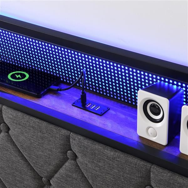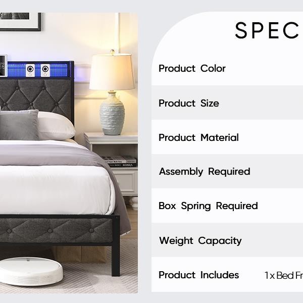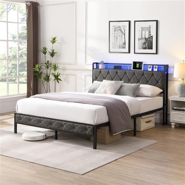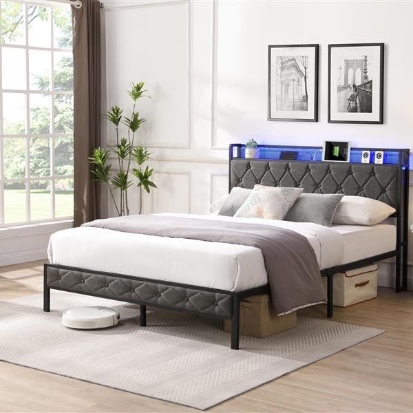 Full Bed Frame with Storage Headboard Charging Station LED Lights Bedroom NEW