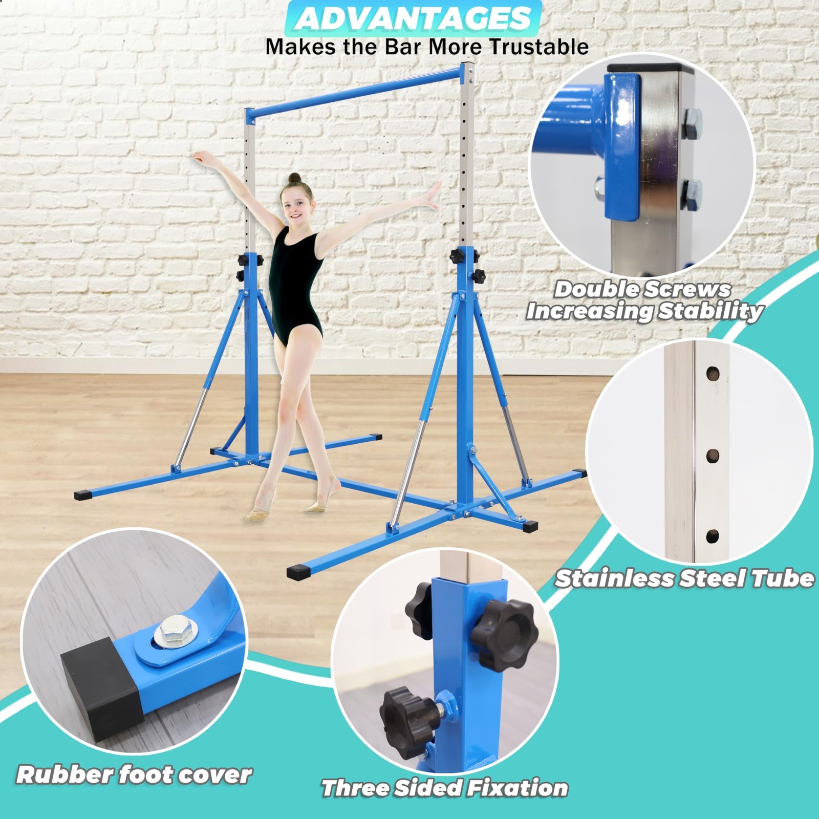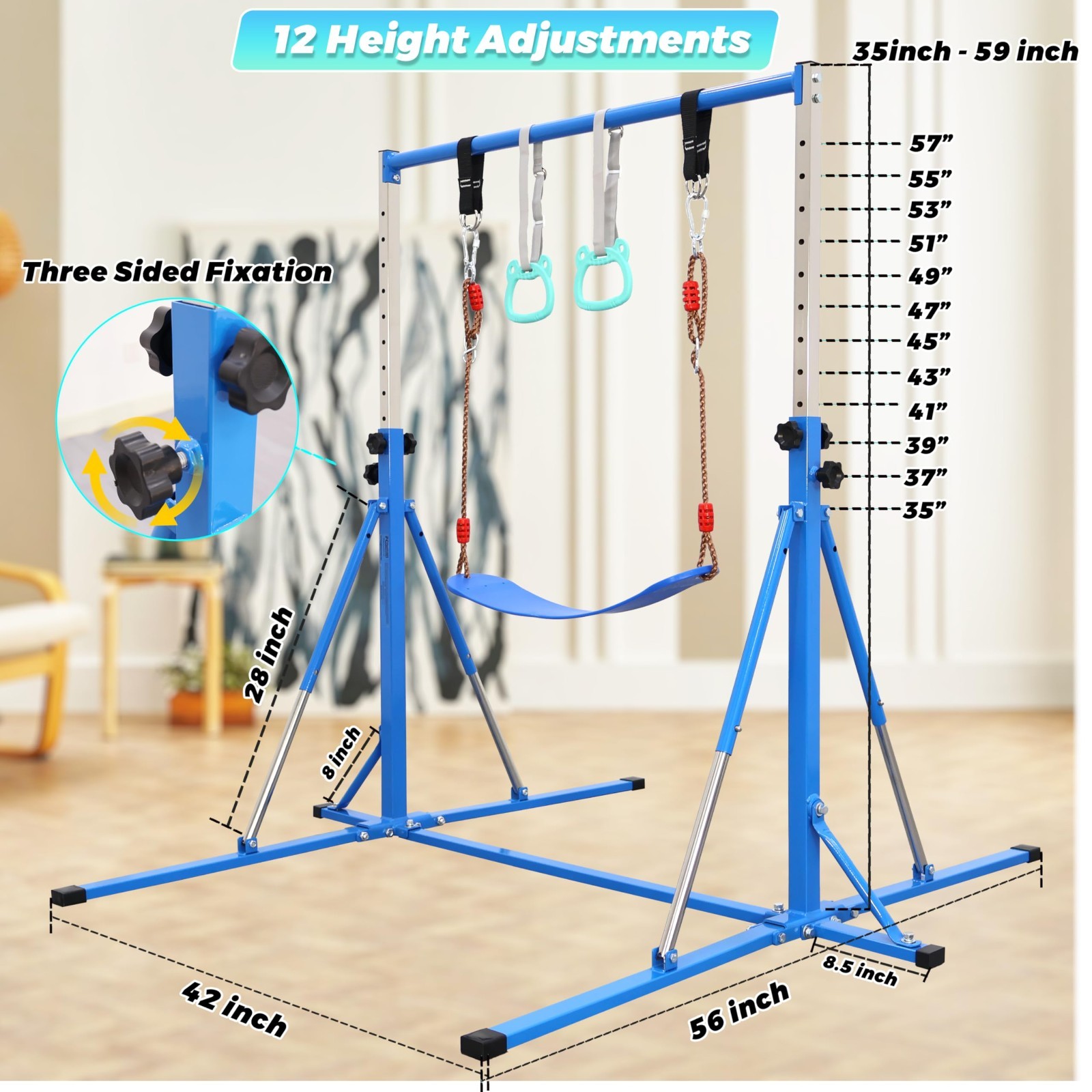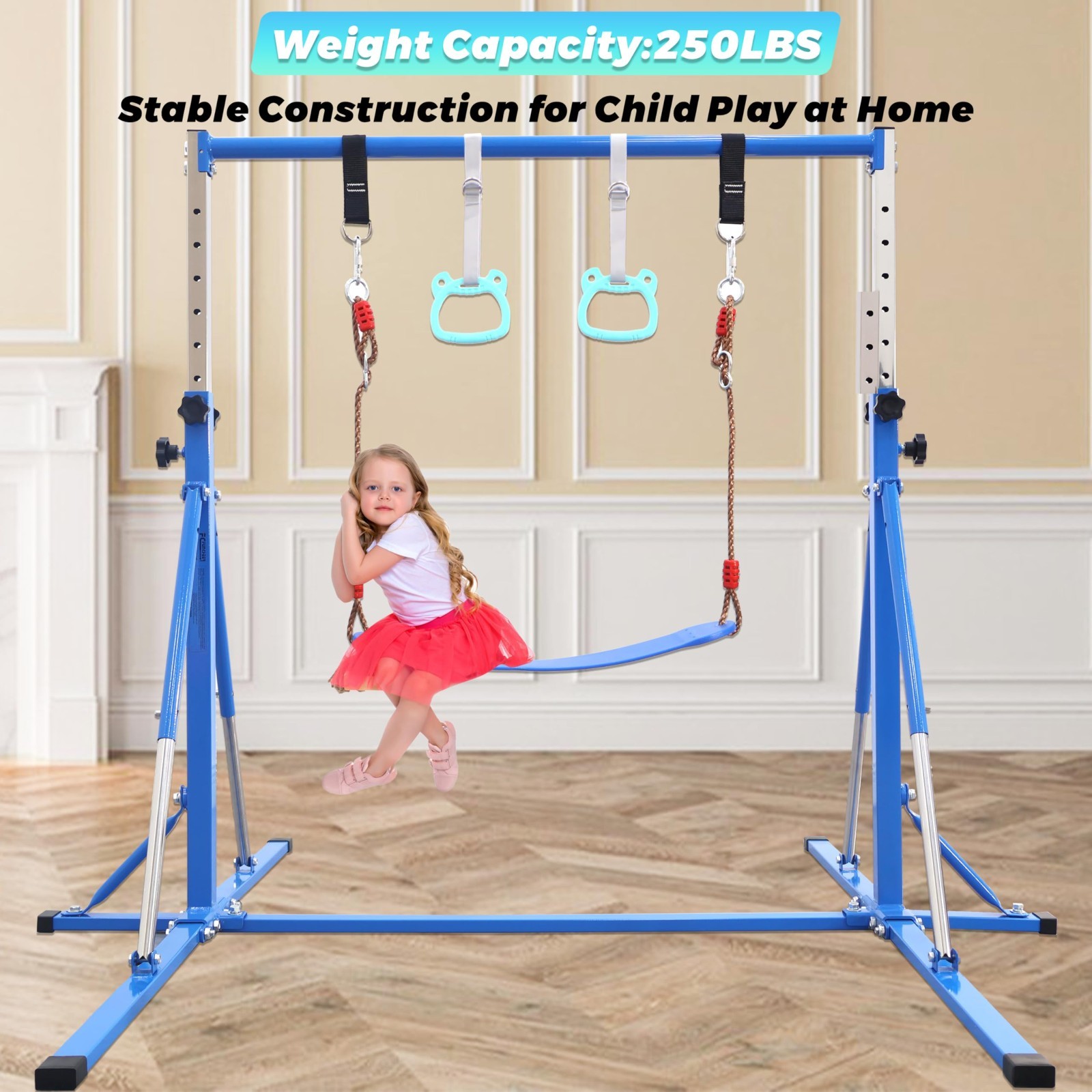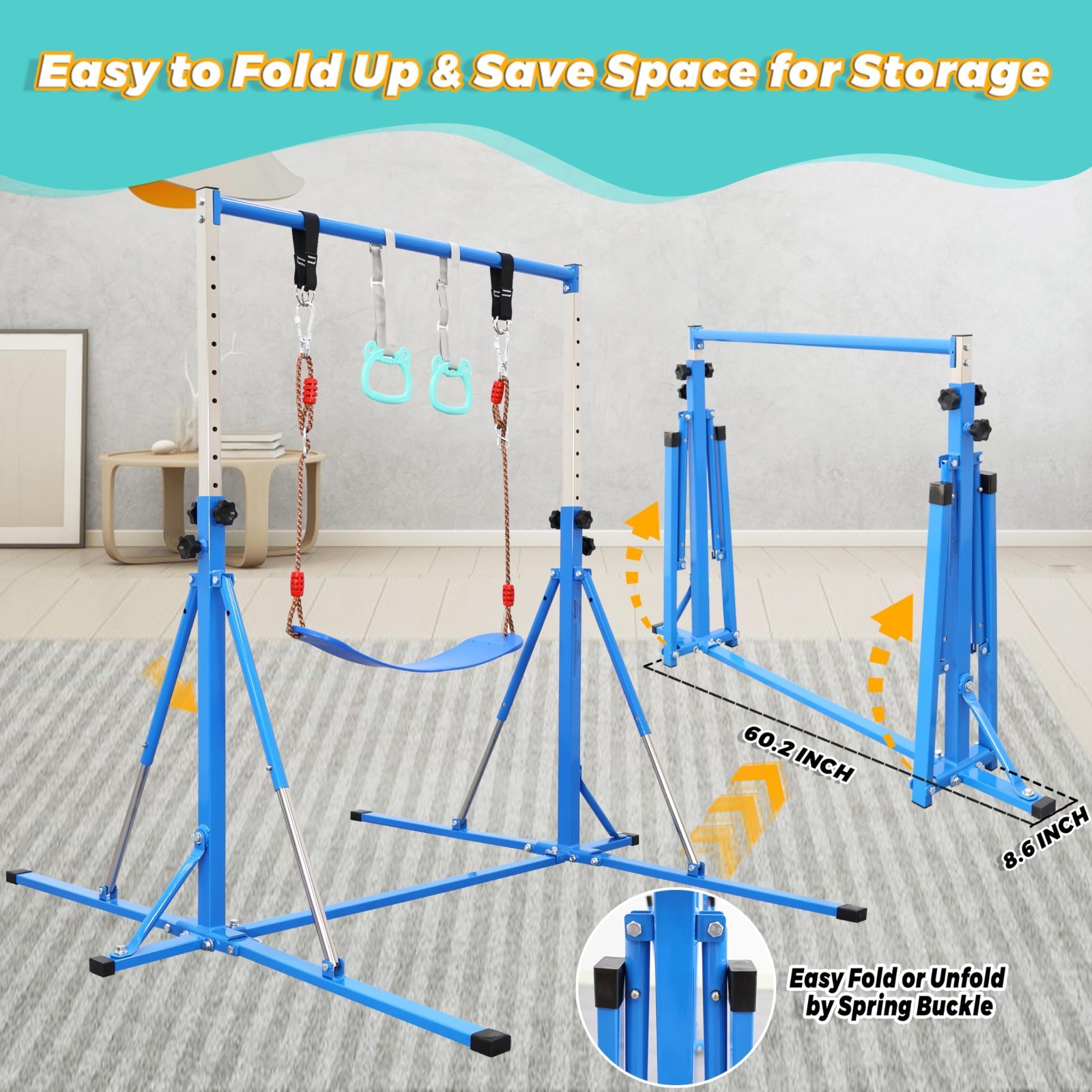 5FT Foldable Gymnastics Bar,Adjustable Kids Training bar for Kids Ages 3-15.Blue