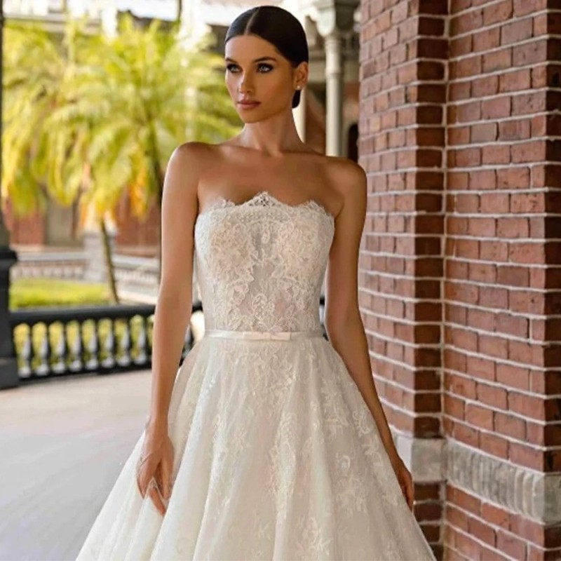 Lace Wedding Dresses Strapless Detachable Off Shoulder Sweep Train Bridal Gowns
