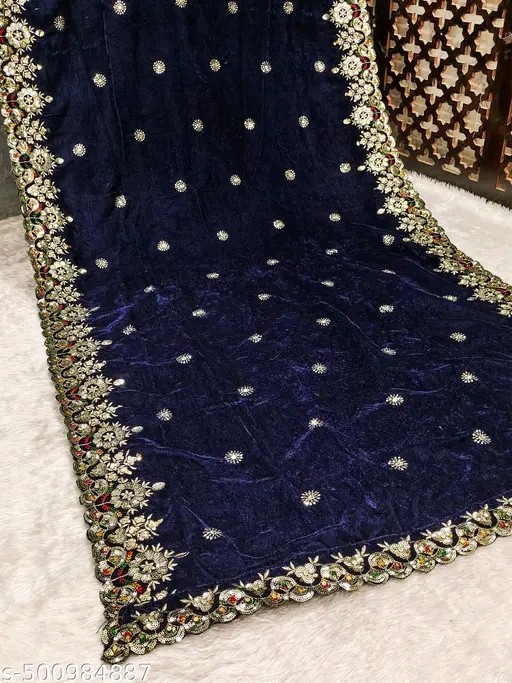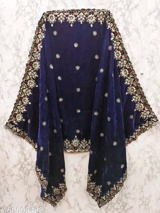 Blue Embroidery Velvet Dupatta For Bride And Women Velvet Shawl Odhani Veil