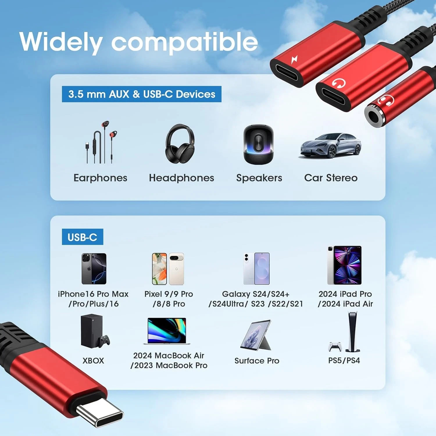 USB C to 3.5Mm Headphone and Charger Adapter, 3 in 1 Dual Type C Aux Splitter Ch