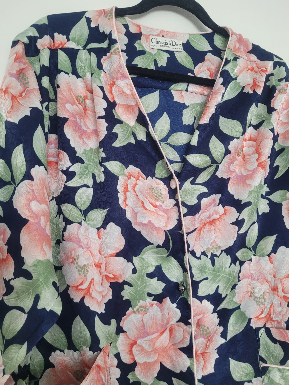 Vintage Christian Dior Lingerie Satin Floral Robe Size M Navy Coquette Pink