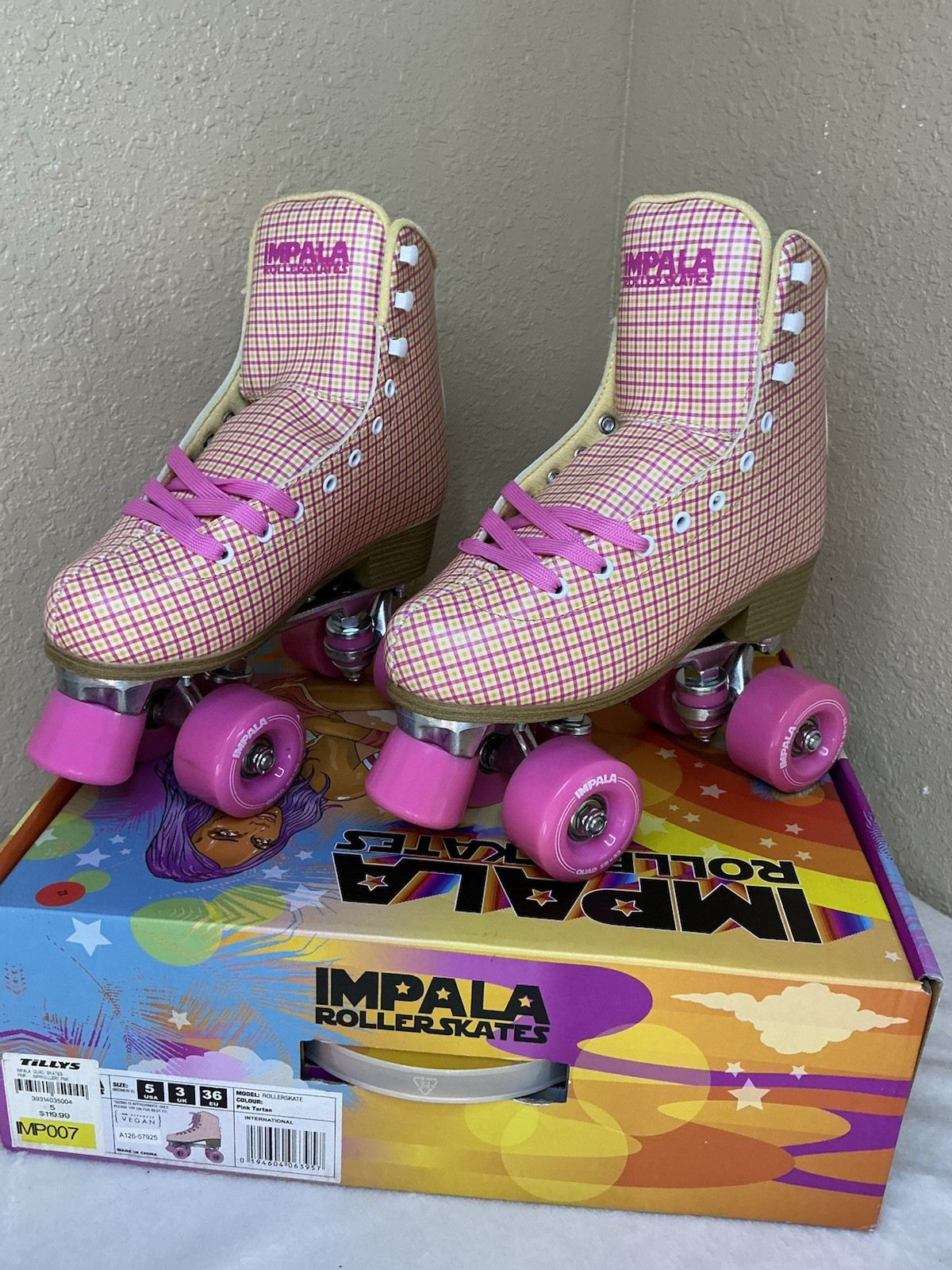 Impala Quad Roller Skates size 5 Pink Yellow Plaid, NEW with OG Box, 120 MRSP