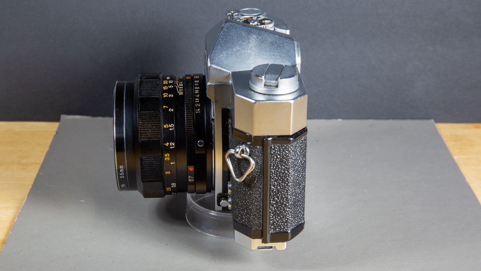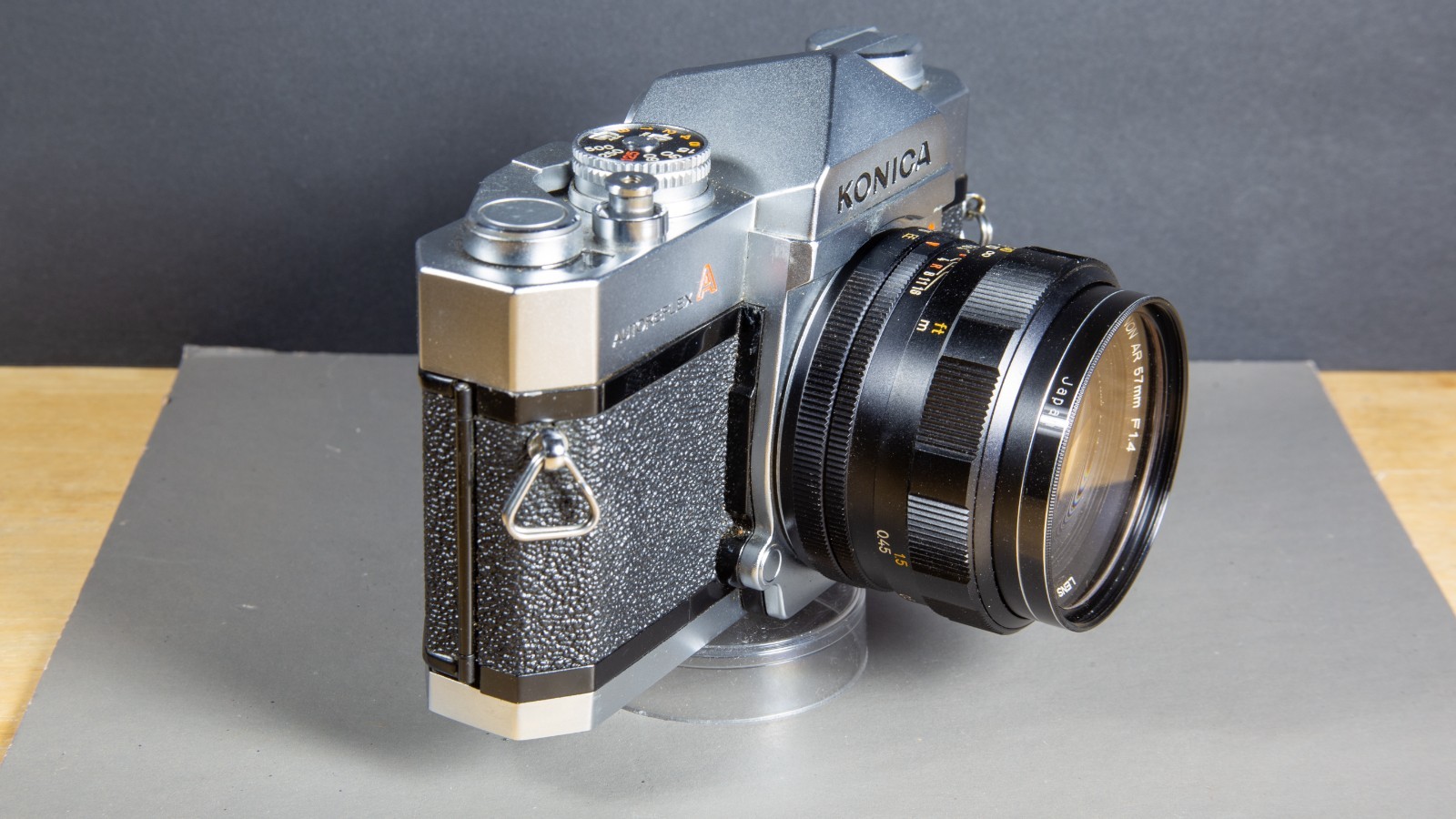 как выглядит Konica Autoreflex T Camera Hexanon 57mm F 1.4 Lens case, lens blades sluggish. фото
