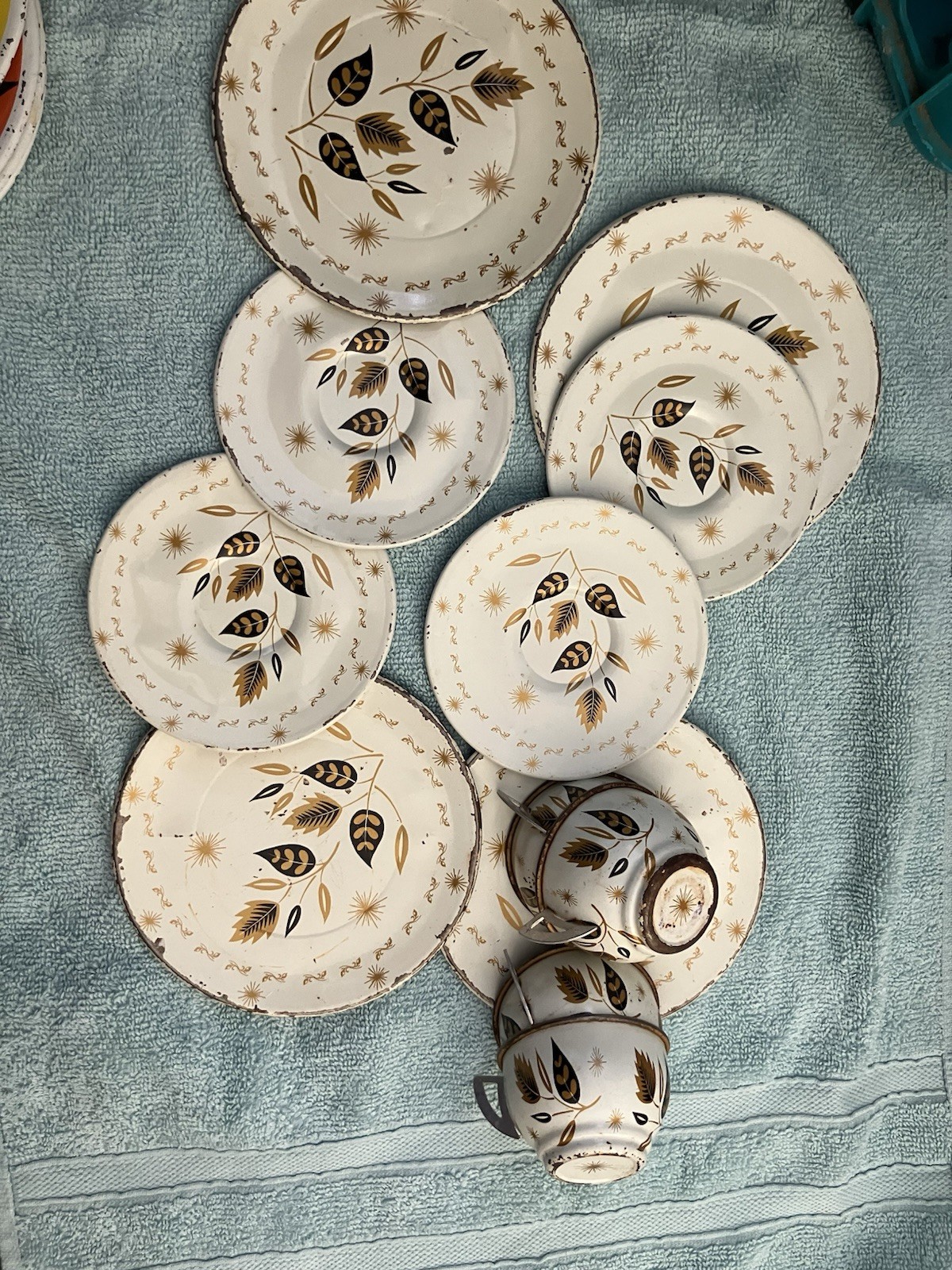 как выглядит 1960-70s 19-pc Orange Floral Child s Tin Tea Set Picnic Cups White/ Brown фото