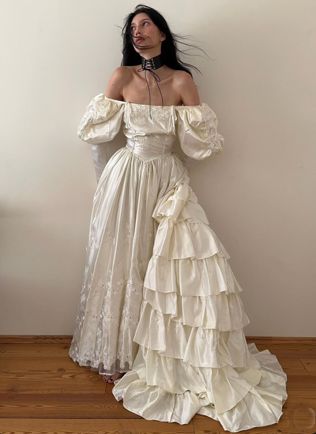 как выглядит Vintage White Ivory Satin Wedding Dresses Off the Shoulder Bridal Gowns A Line фото