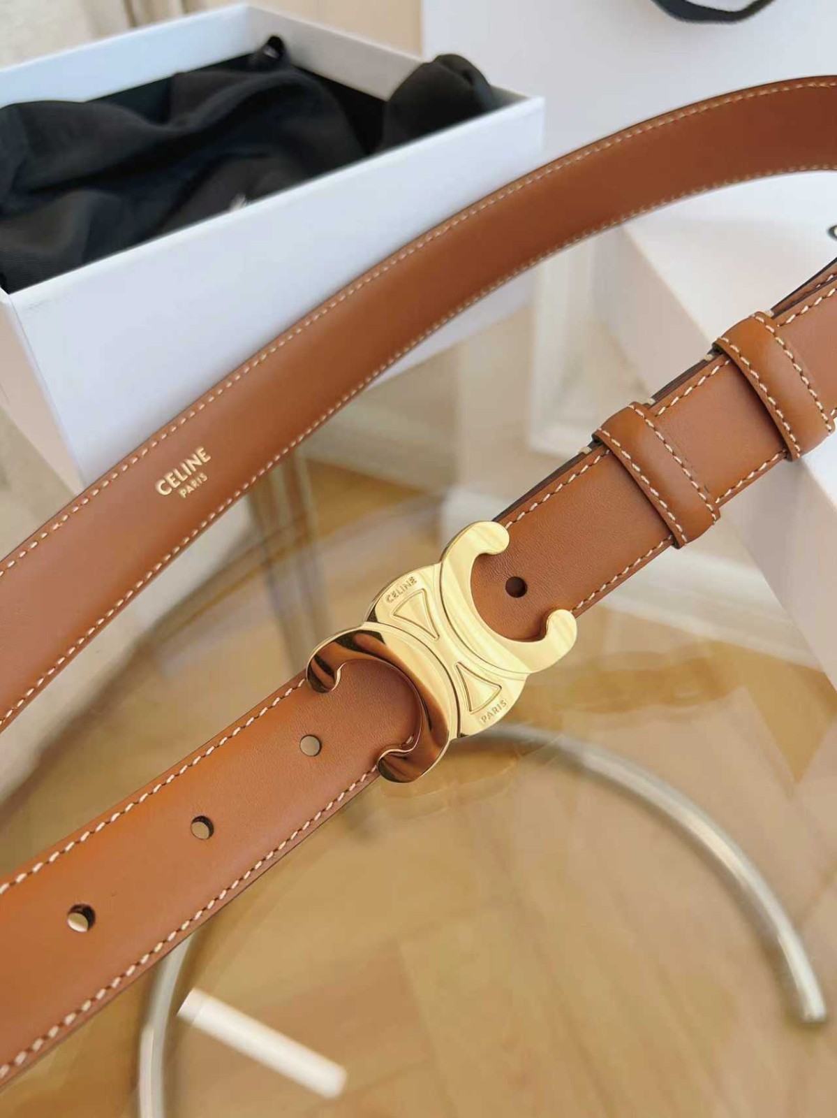 как выглядит New Celine Belt Gold Triomphe Logo Brown Calfskin Leather Womens Belt 25mm фото