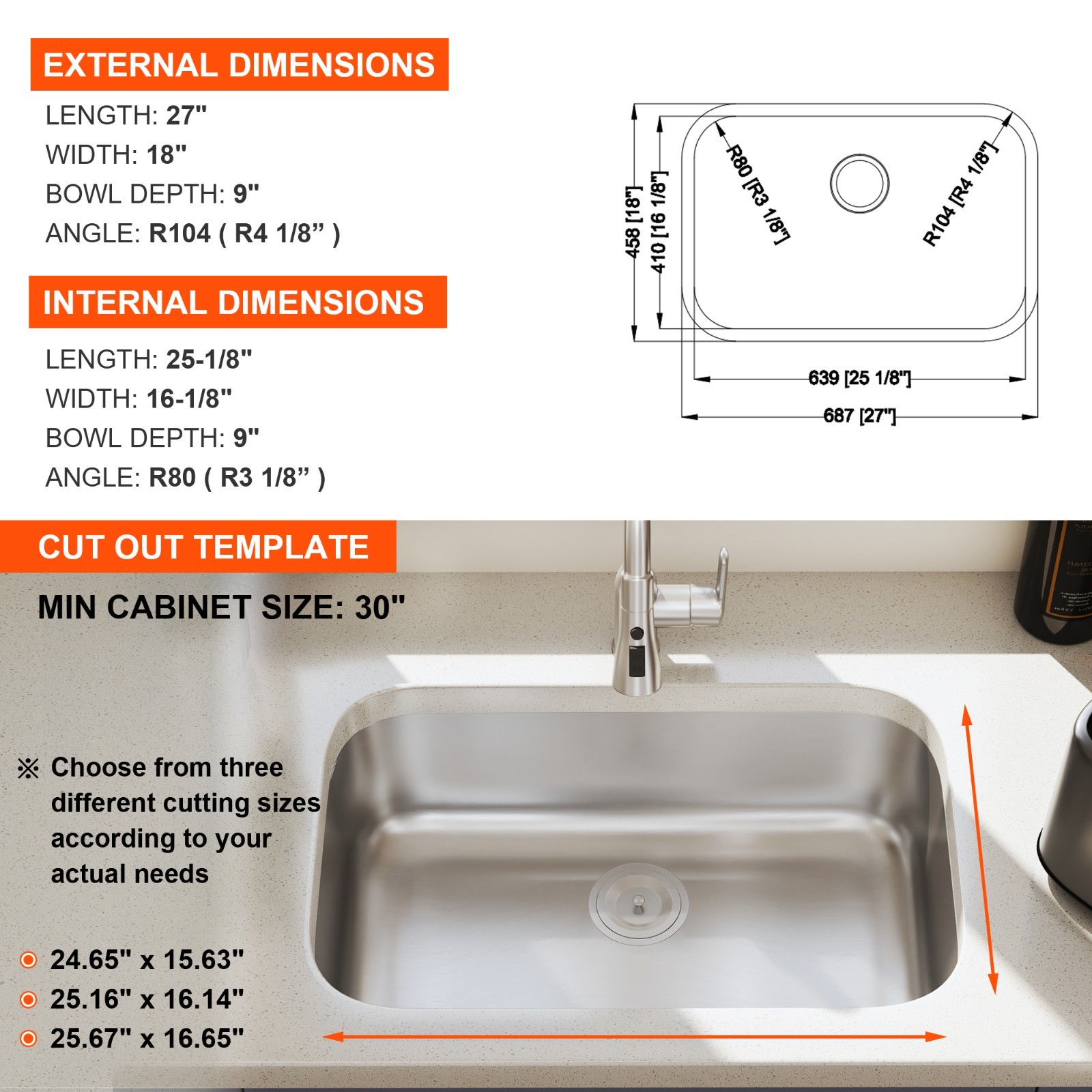 27 Inch Undermount 18 Gauge Single Bowl Stainless Steel Kitchen Sink