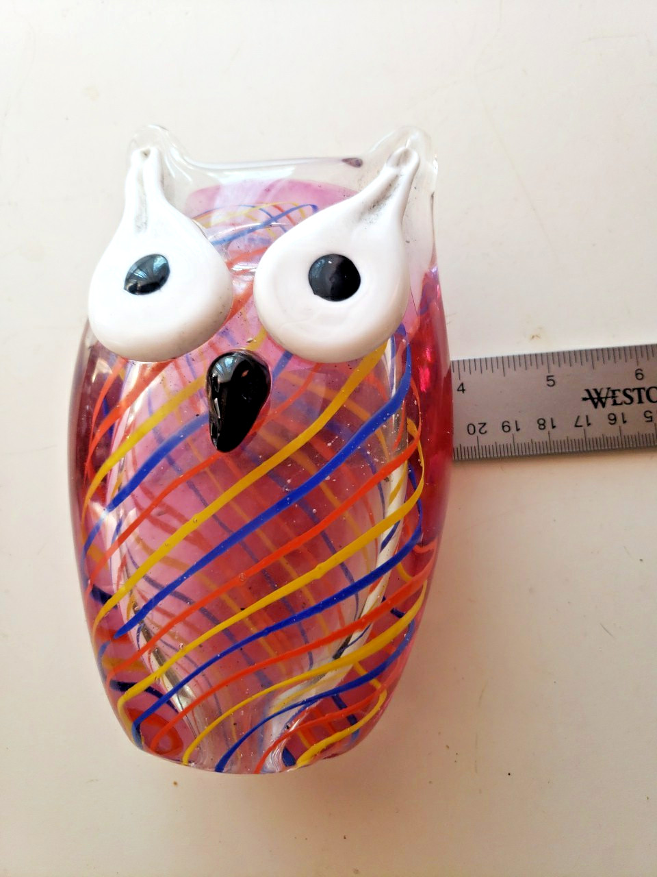 Murano Style Art Glass Owl Figurine Vibrant Stripes Red Yellow Blue Swirl