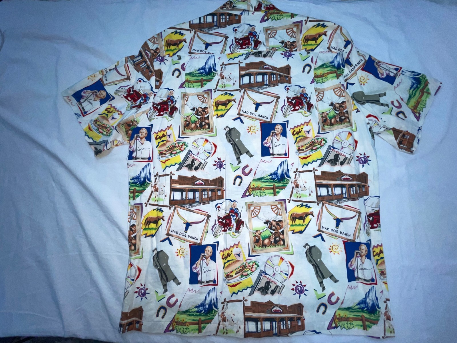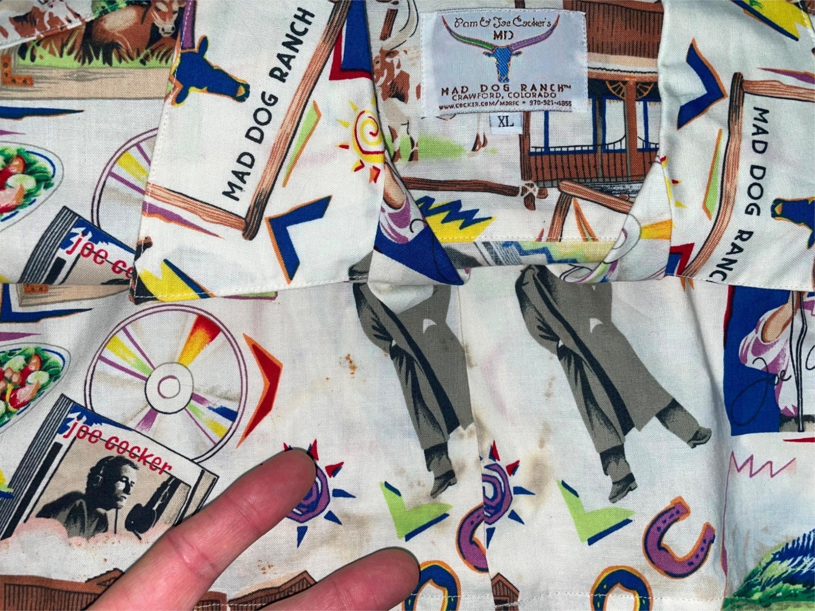 VTG MENS XL HAWAIIAN PAM JOE COCKER MAD DOG RANCH PRINT SURF SHIRT
