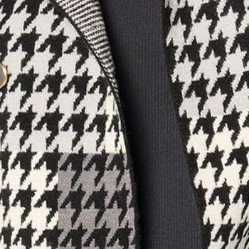 Особенности: --Fabrication: jacquard sweater knit--Hardware: button-front clos, foldover collar, long set-in sleeves, houndstooth pattern--Fit: semi-fitted; follows the lines of the b, dry flat--Imported