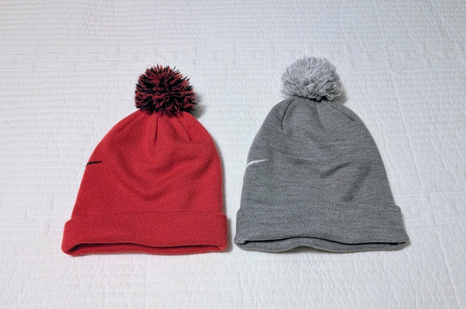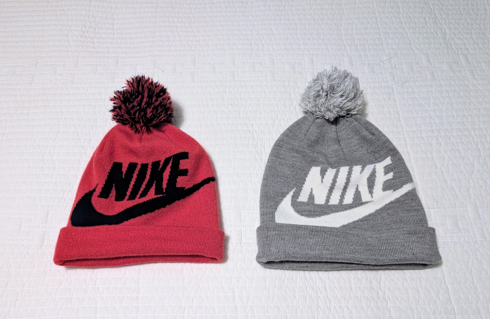 Lot Of 2 Nike Air Swoosh Pom Beanie Winter Hats - Gray Pink Youth Snow Ski