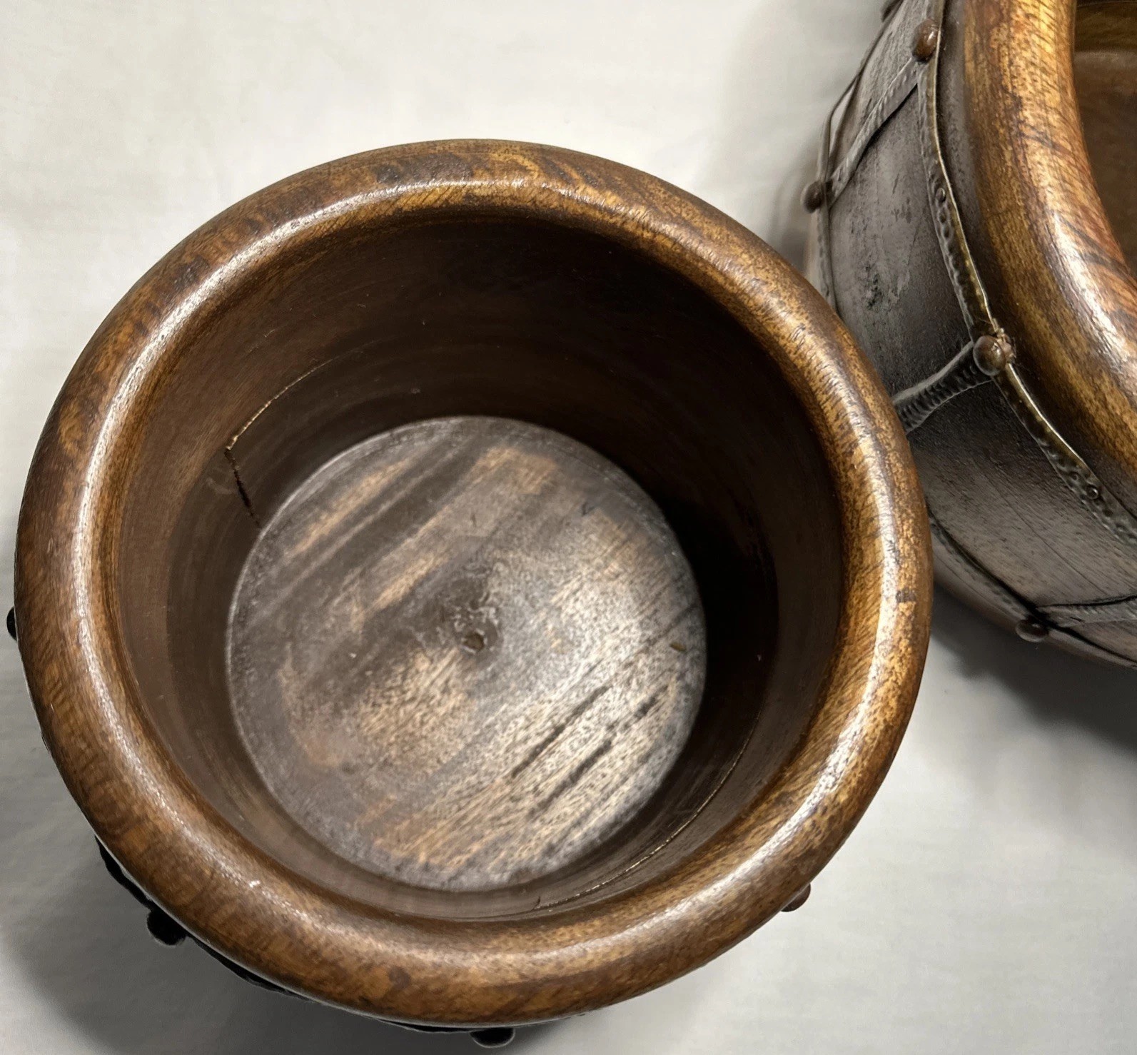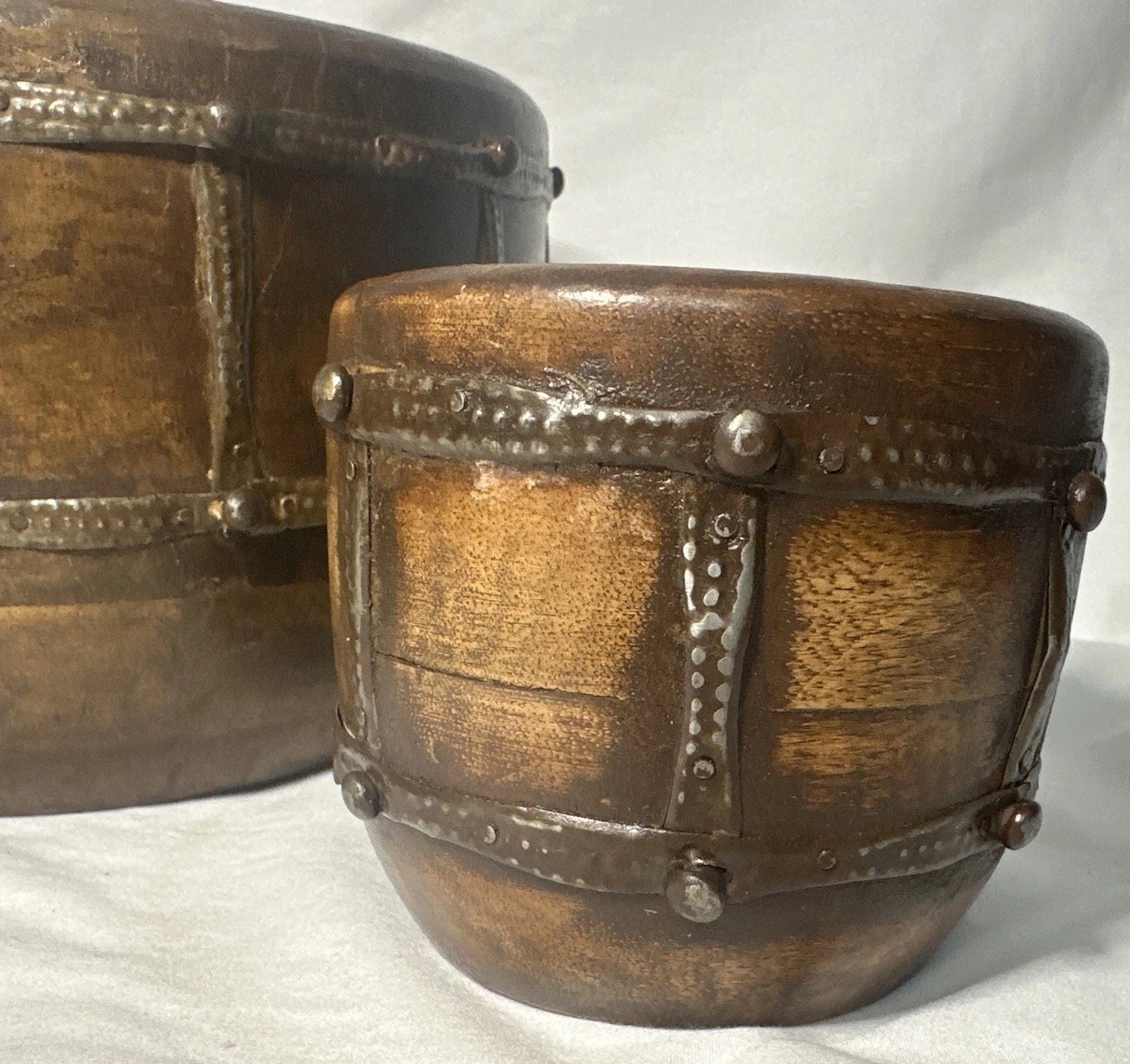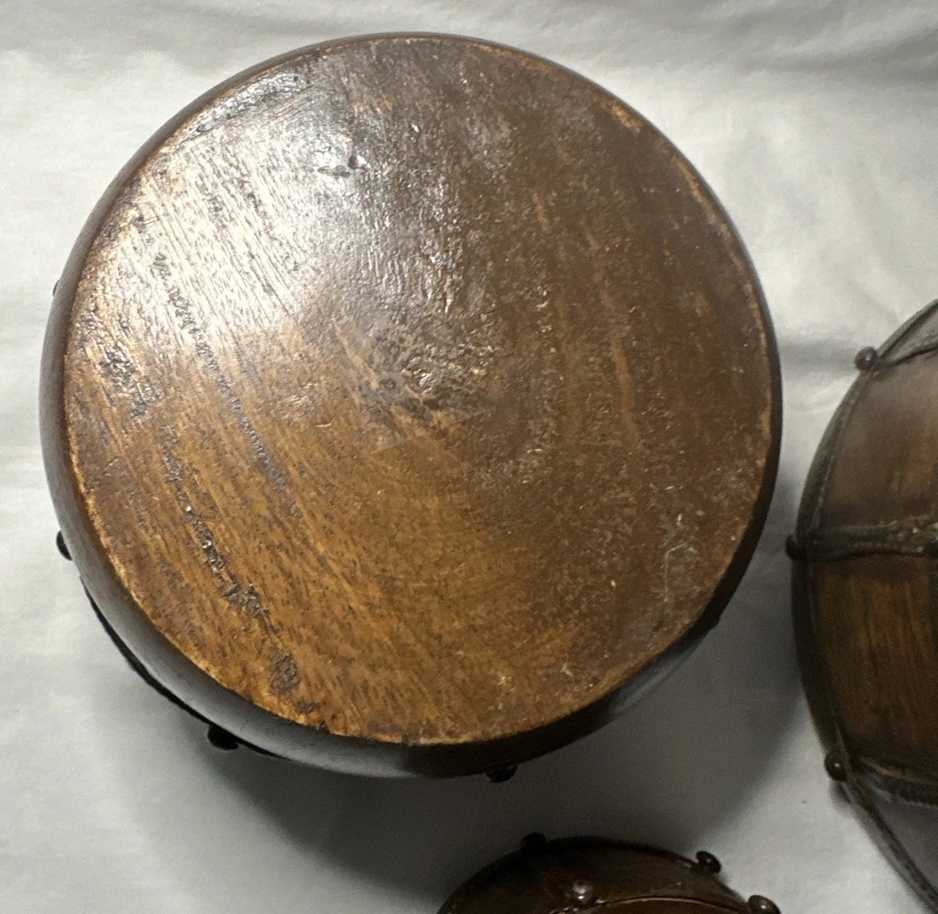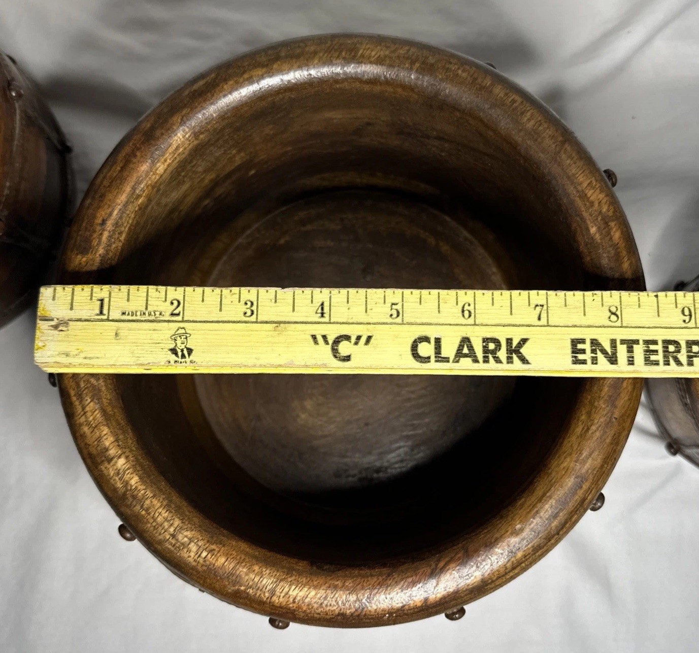 Set of 3 Stacking Wood Bowls Metal Bands Accents India Carved Heavy Rustic Pot