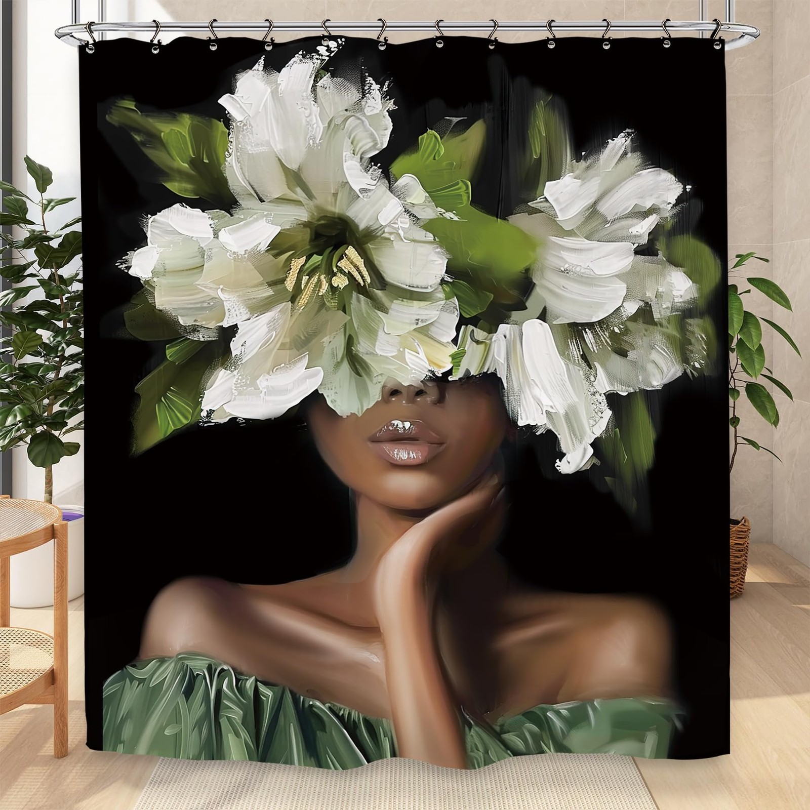 African Olive Green Shower Curtain 60Wx72L Inch Black Girl Woman Flower Oil P...