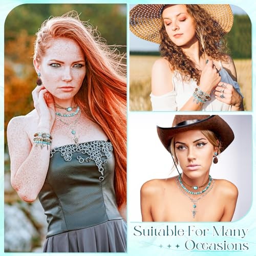 18 Pcs Western Turquoise Jewelry Sets for Women with Boho Necklace, Oval