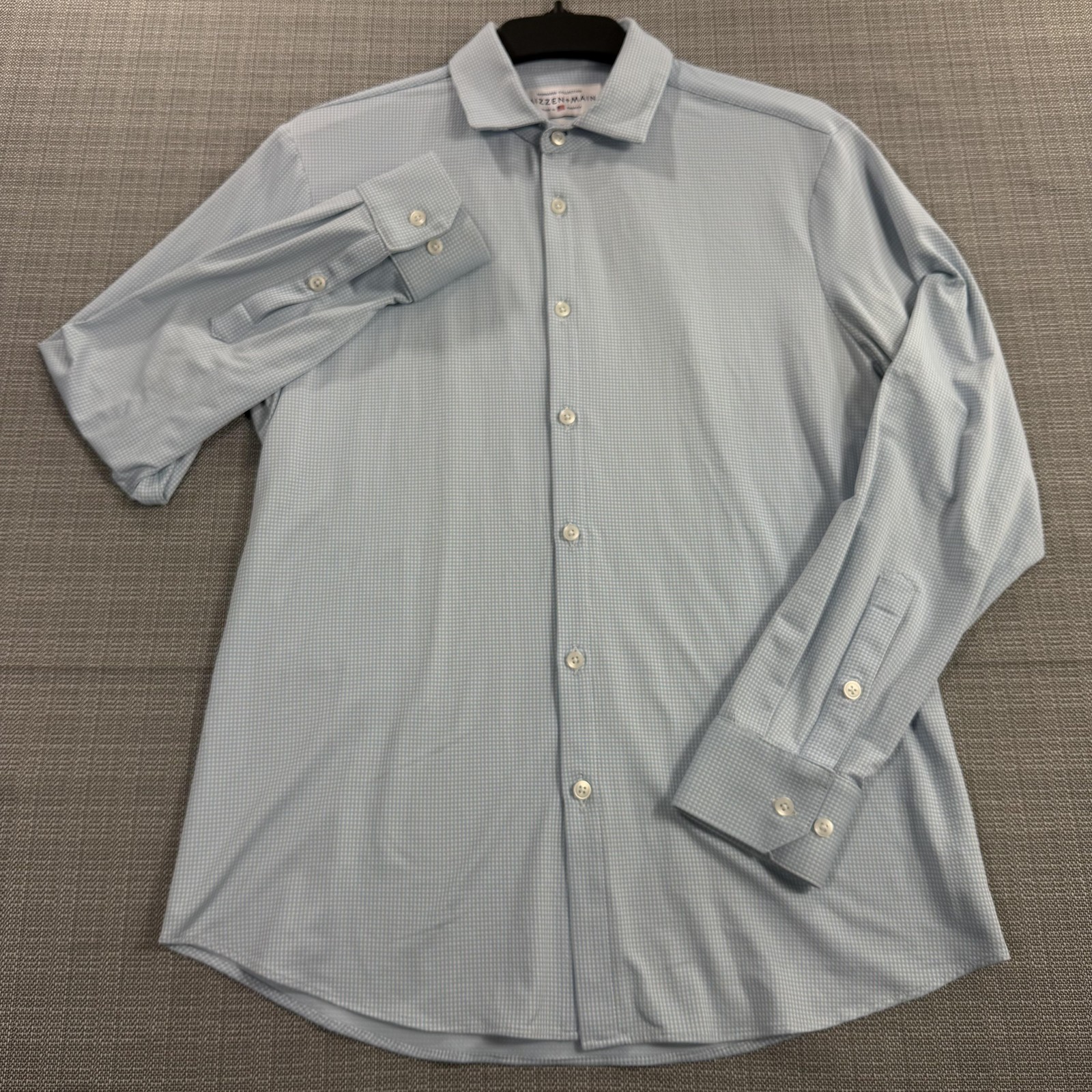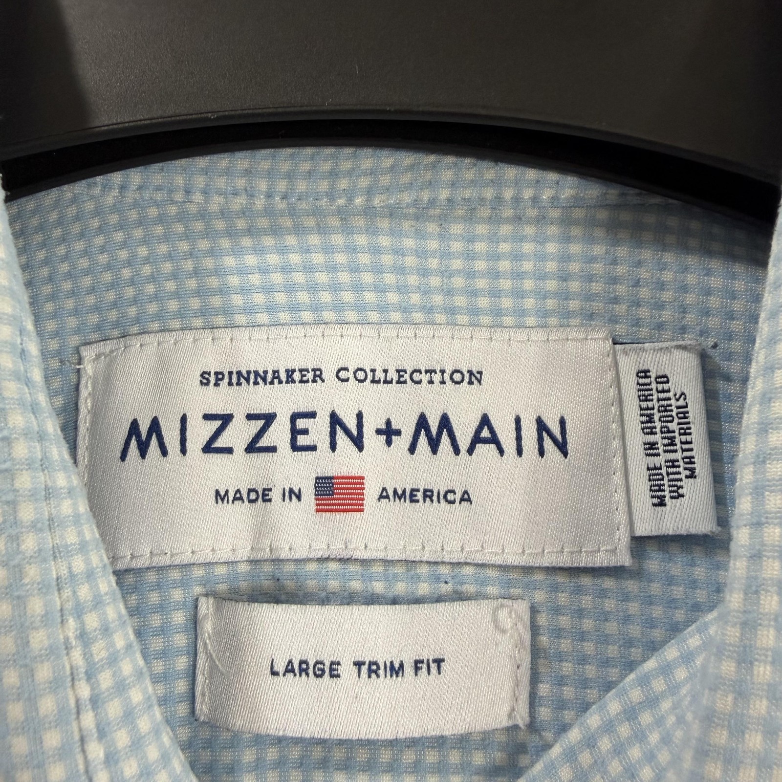 как выглядит Mizzen Main Shirt Mens Large Trim Fit Blue Gingham Non Iron Stretch Dress фото