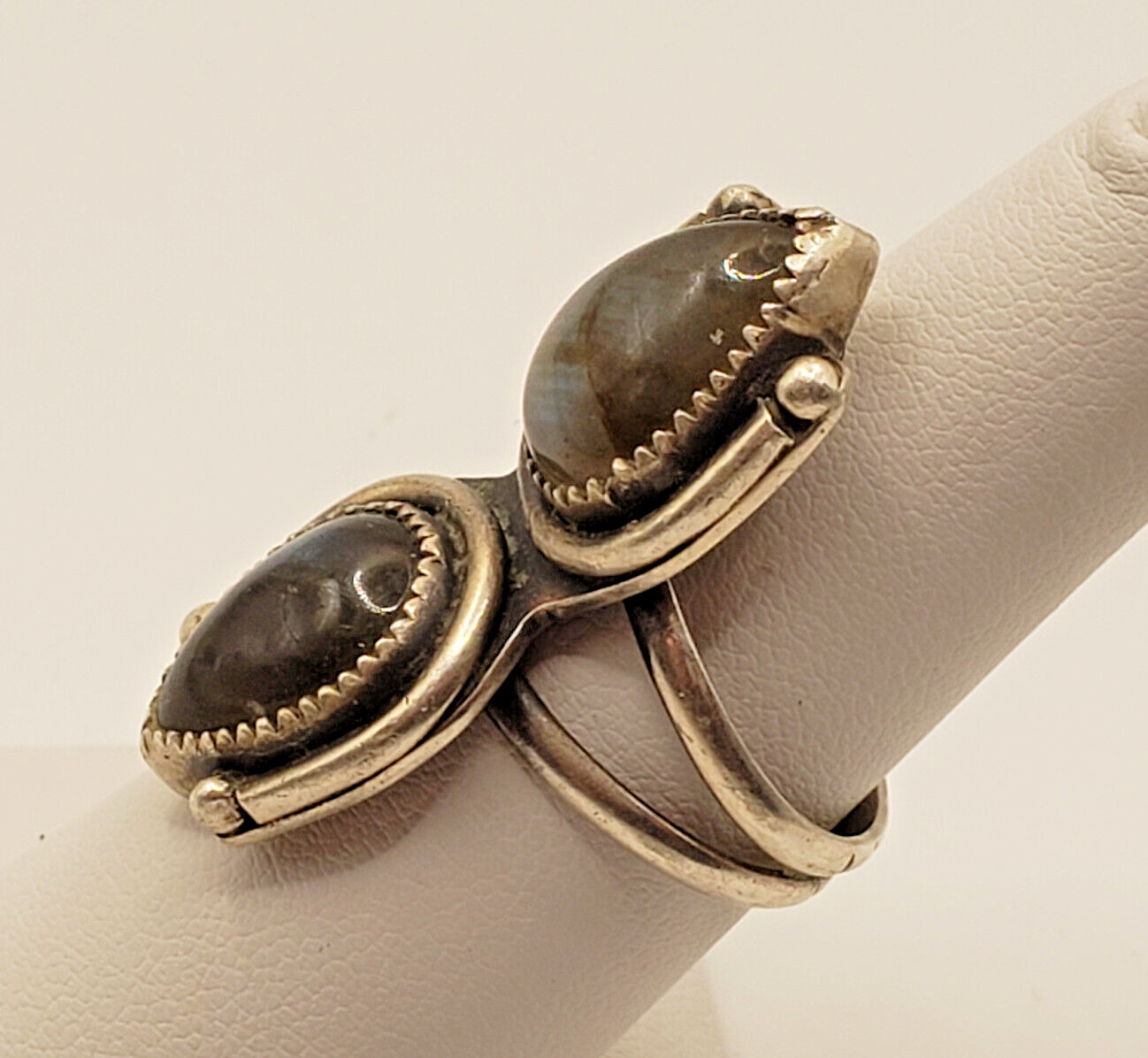 как выглядит Sterling RING Labradorite Two Stones Bezel Set Size 6.5 7 gm BW Hallmark .925 фото