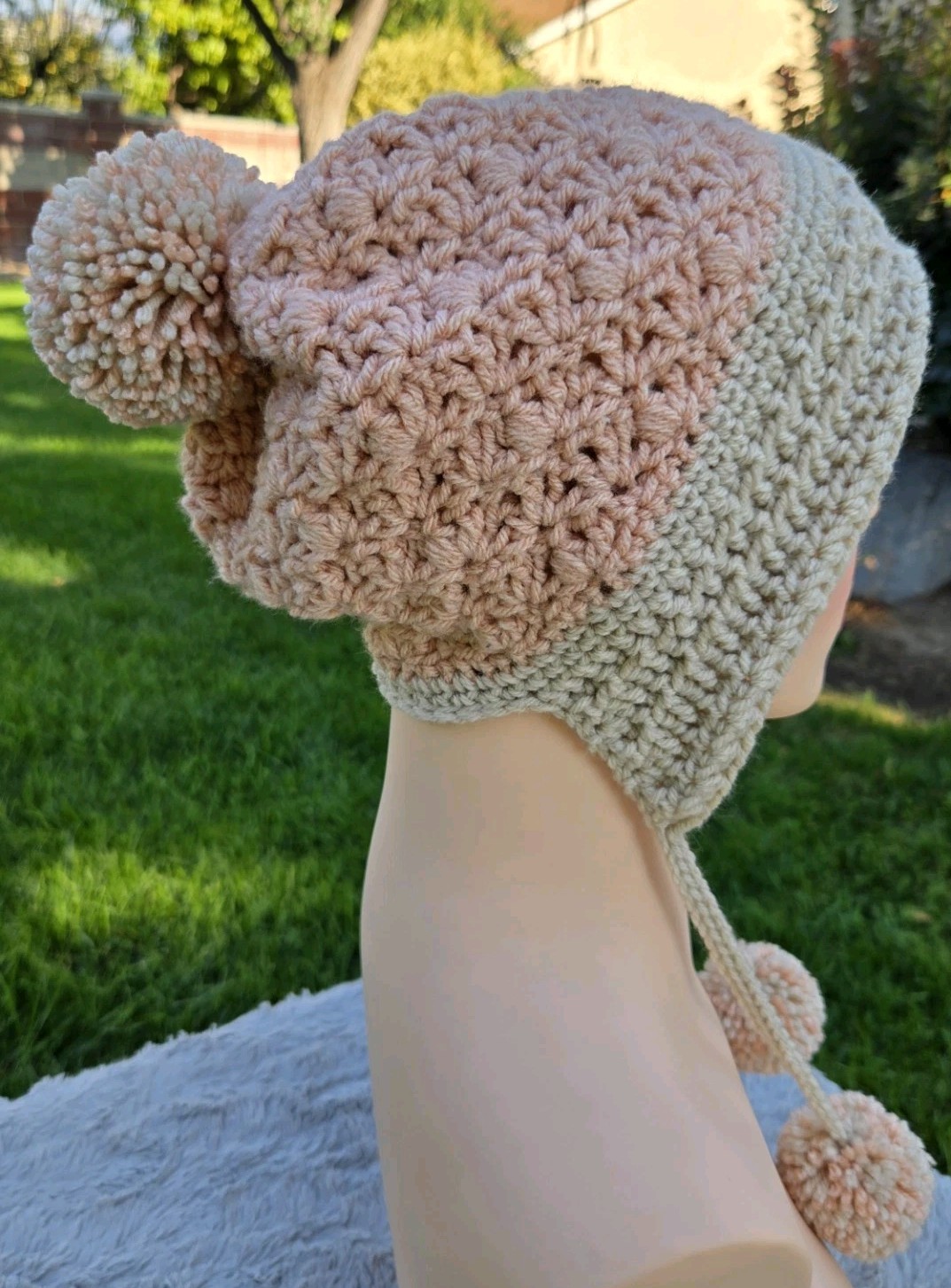 Handmade Crochet Slouch Earflap Hat with Pom Poms - Salmon Pink And Beige Beanie