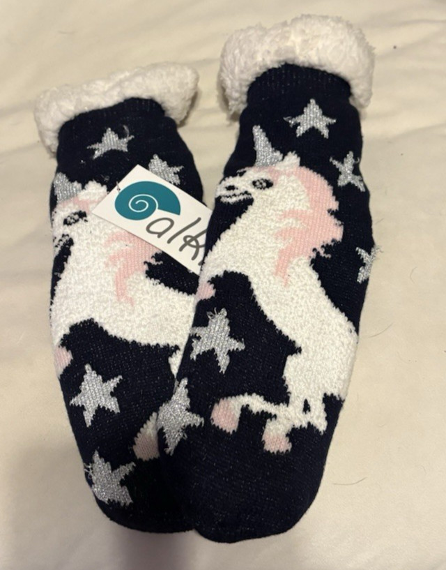 как выглядит Womens faux fur fuzzy socks w/ Unicorns фото