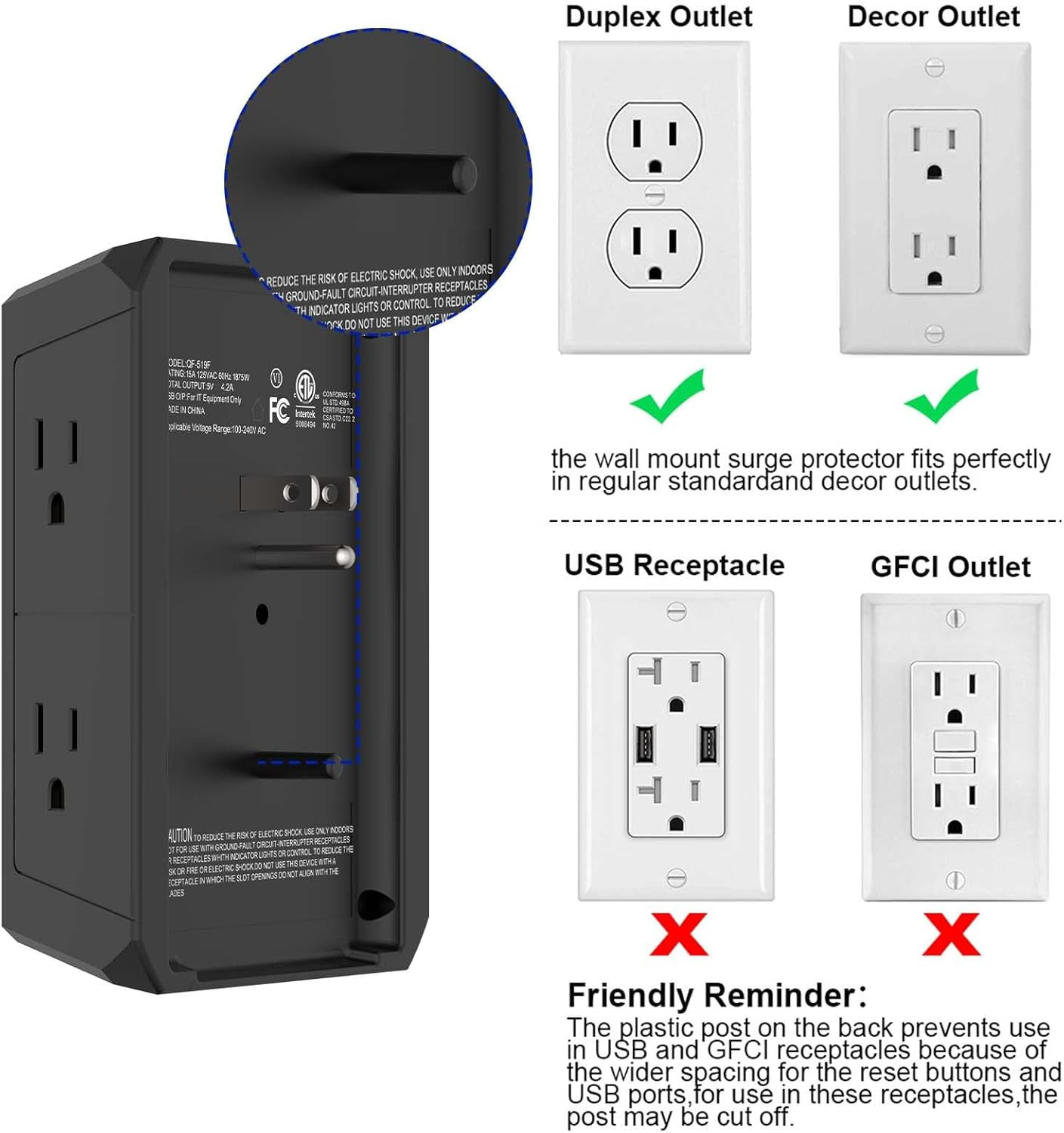 Multi Outlet Extender Surge Protector - Multi Plug Wall Outlet with 5 AC Outlet