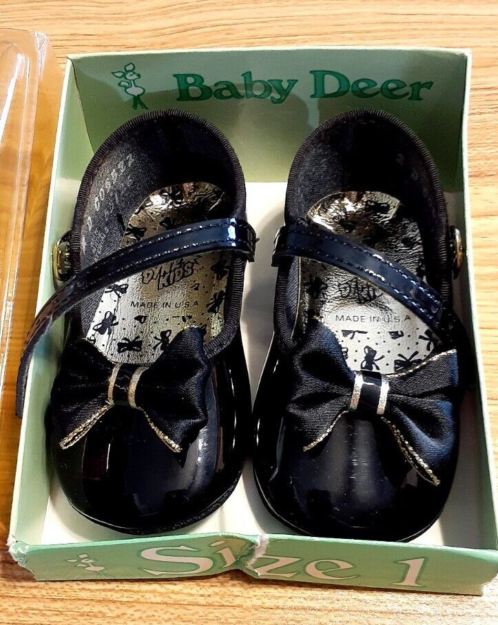 Vintage/New BABY DEER Patent Leather Infant Dress Shoes Size Black Gold Bow